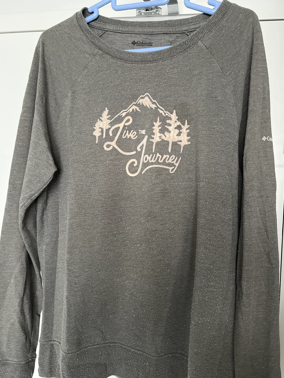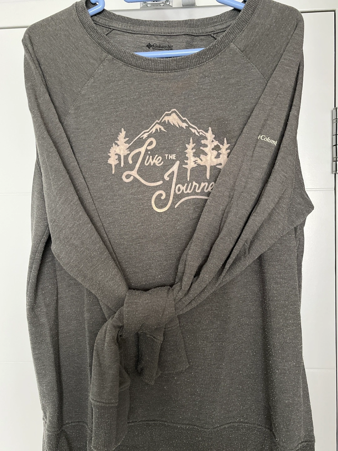 Grey long sleeve sweatshirt with a mountain and trees graphic. It says 'Live the Journey' on the front. Size M.