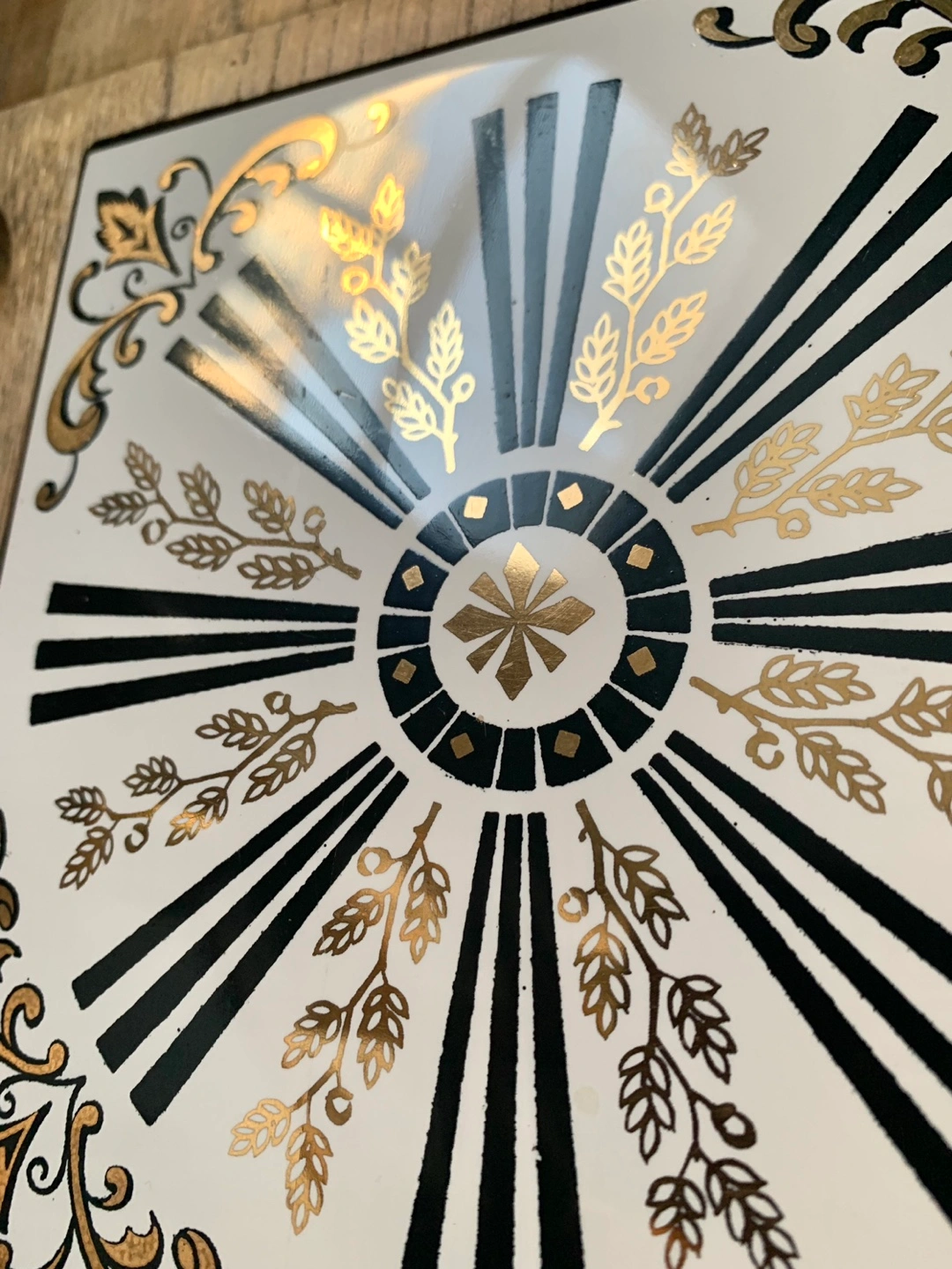 The inset tile featuring a black and reflective gold design is ideal for cutting cheese or meat.