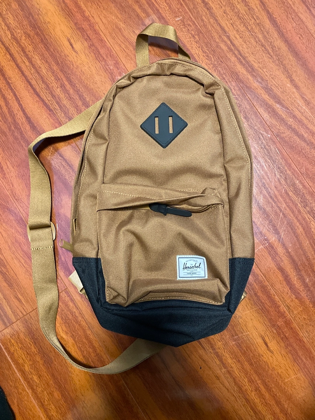 66Tan and black backpack with a single strap. Small and compact. Excellent condition. *BRAND NEW*
