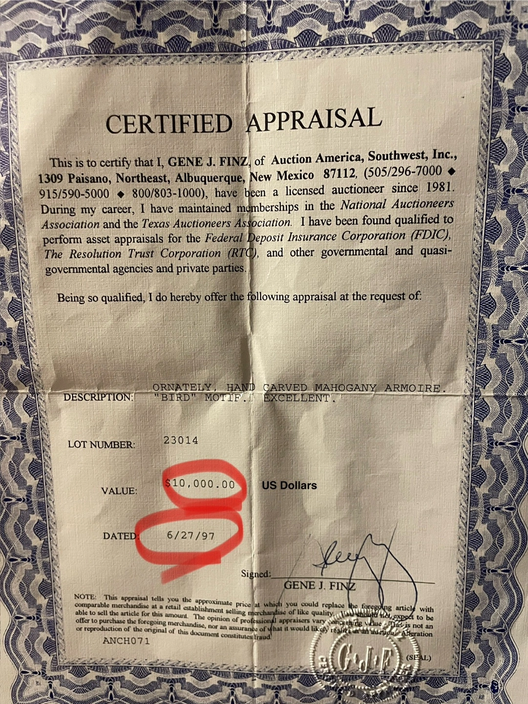 Overall dimensions 83.5” H x 52.5” W x 22.75” D. Appraised at $10,000 USD in 1997 (certificate in photos).