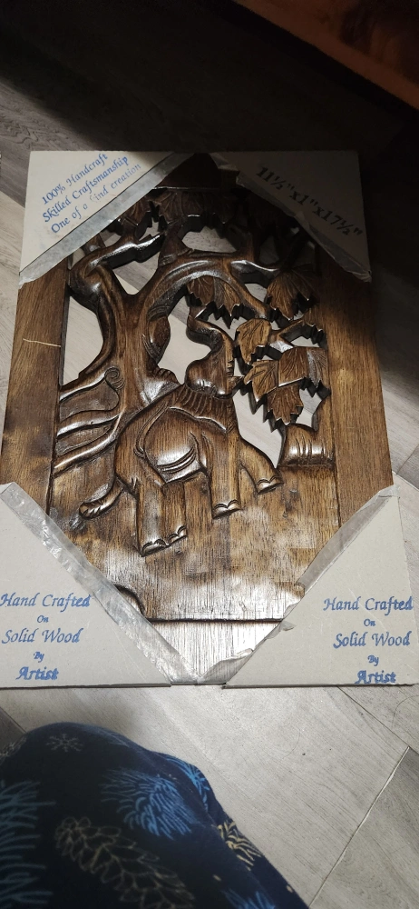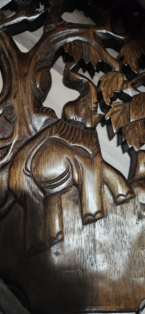 Hand crafted wooden wall hanging with a carved elephant and tree. Made of solid wood.