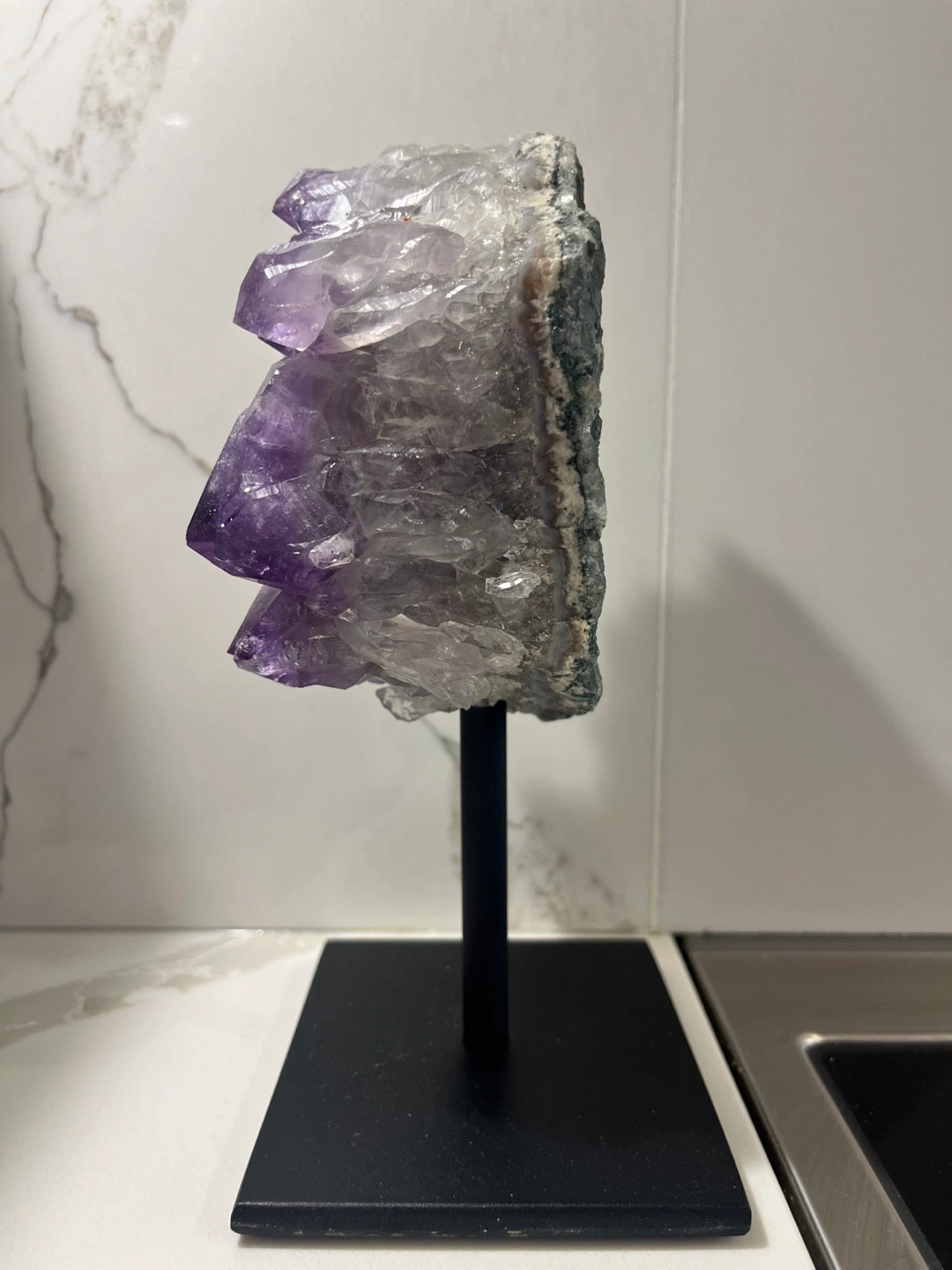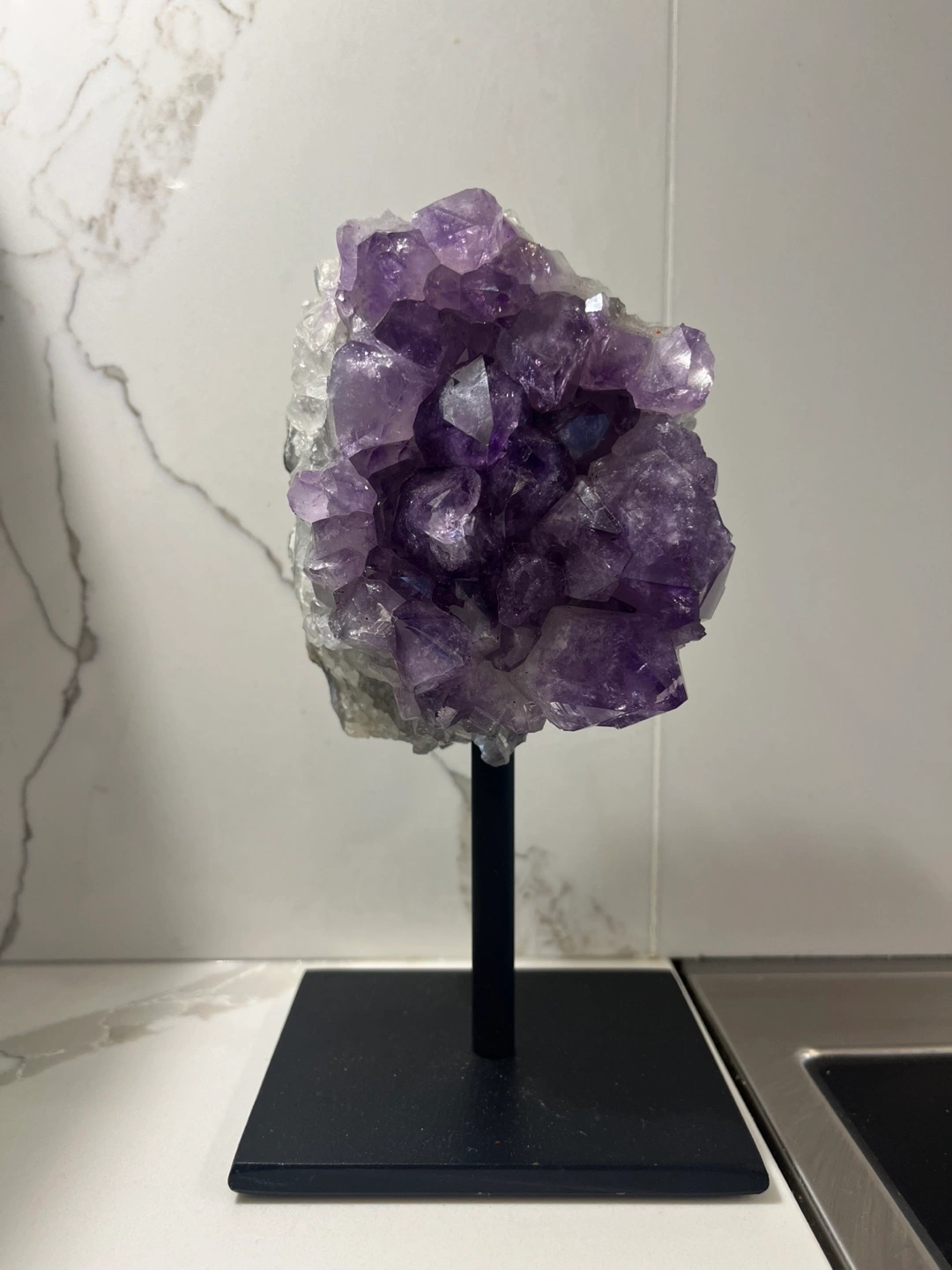 Originally $112. Large amethyst crystal on black stand. Beautiful purple colour and crystal formations. Has good weight to it.