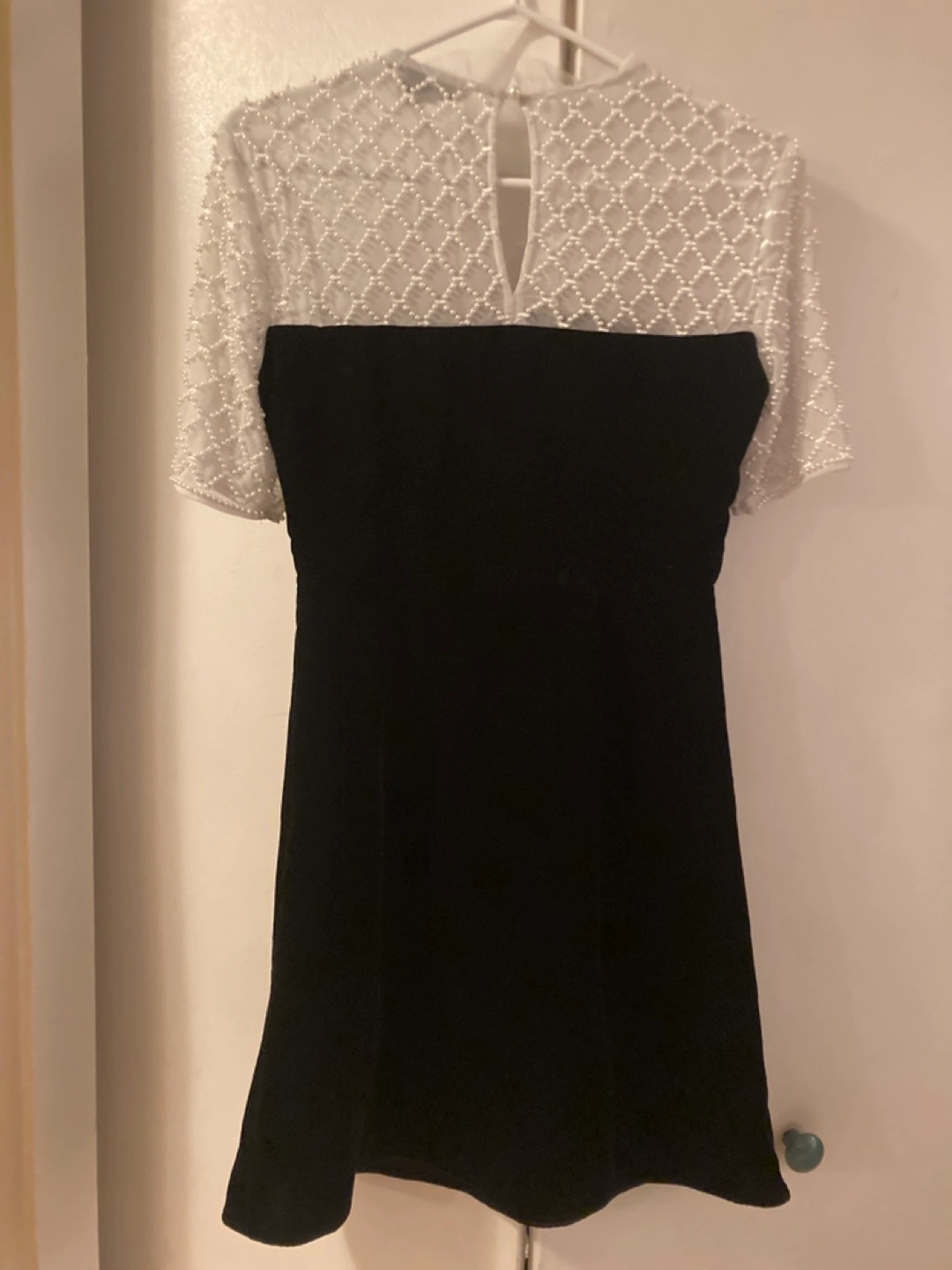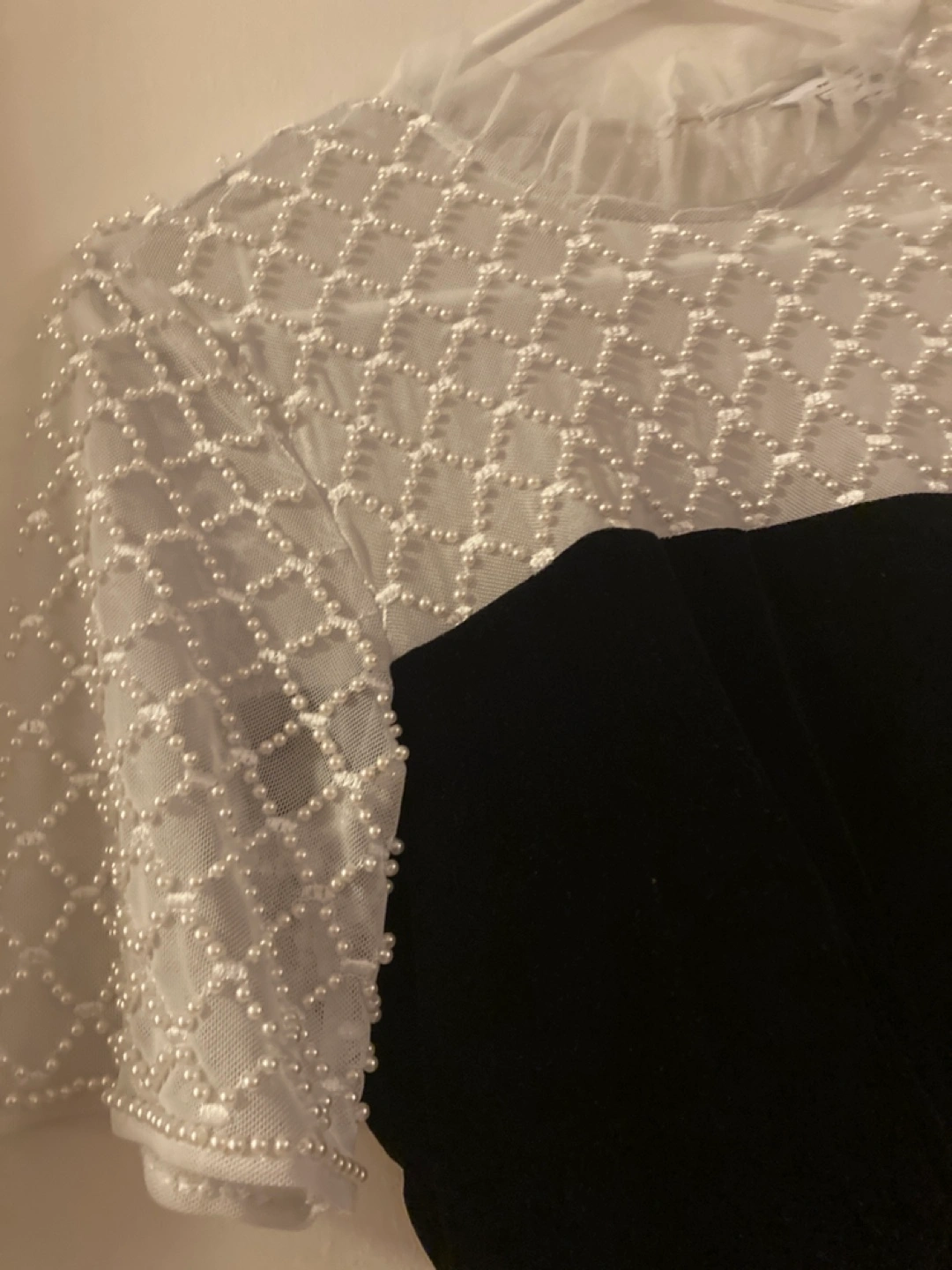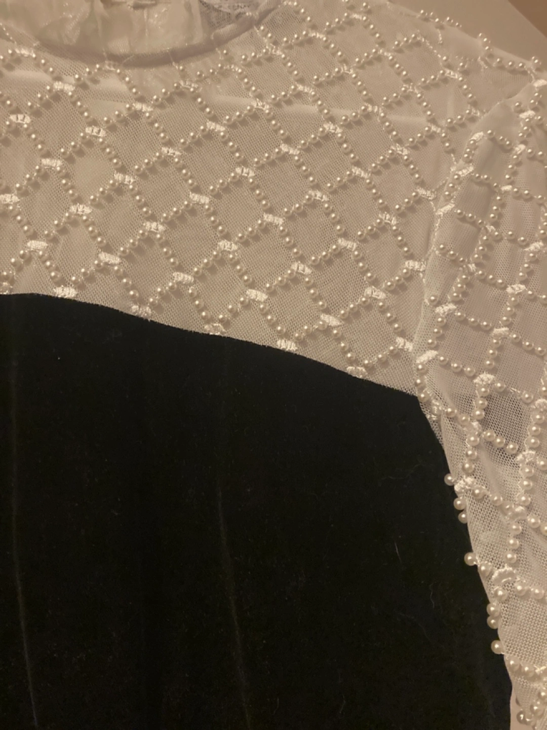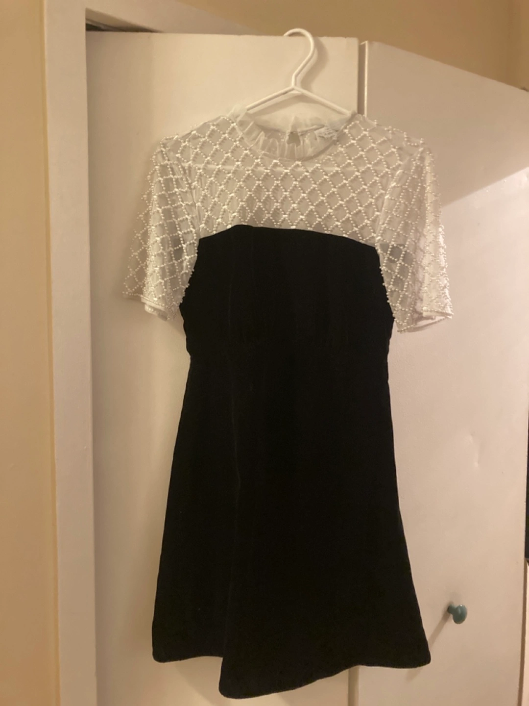 Black velvet dress with pearl embellished sheer overlay and short sleeves. Size small/xs. Worn a couple times. Perfect for any special occasion and season. Pickup Hurontario and Dundas in Mississauga. Cash only