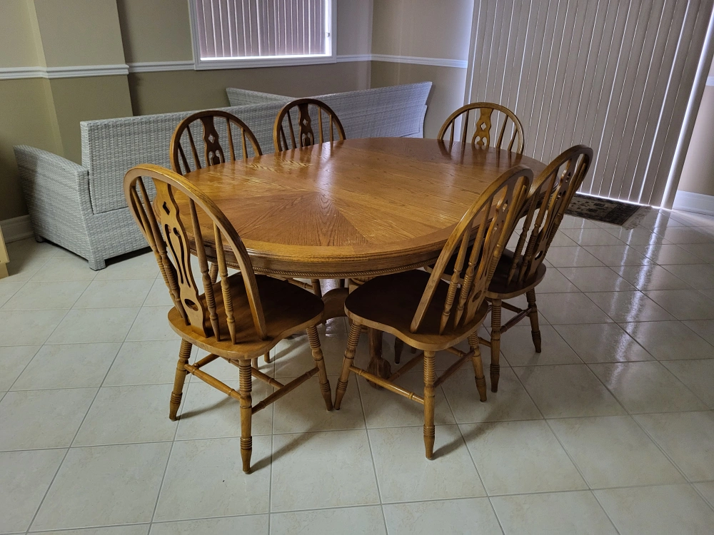 Round table and six chairs. Wooden construction. Good condition. Middle sleeve can be removed to make into a circle table. Pick up only.