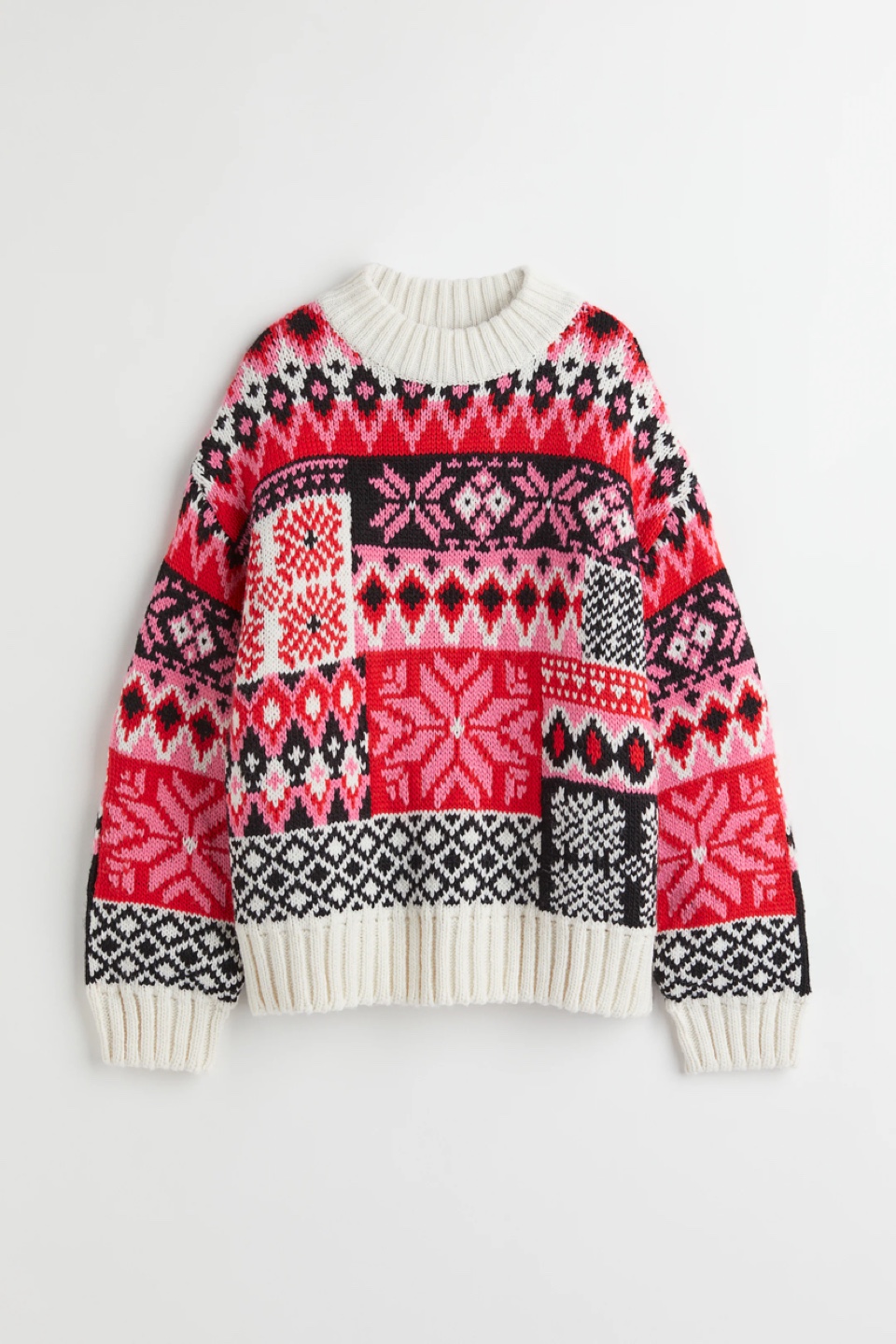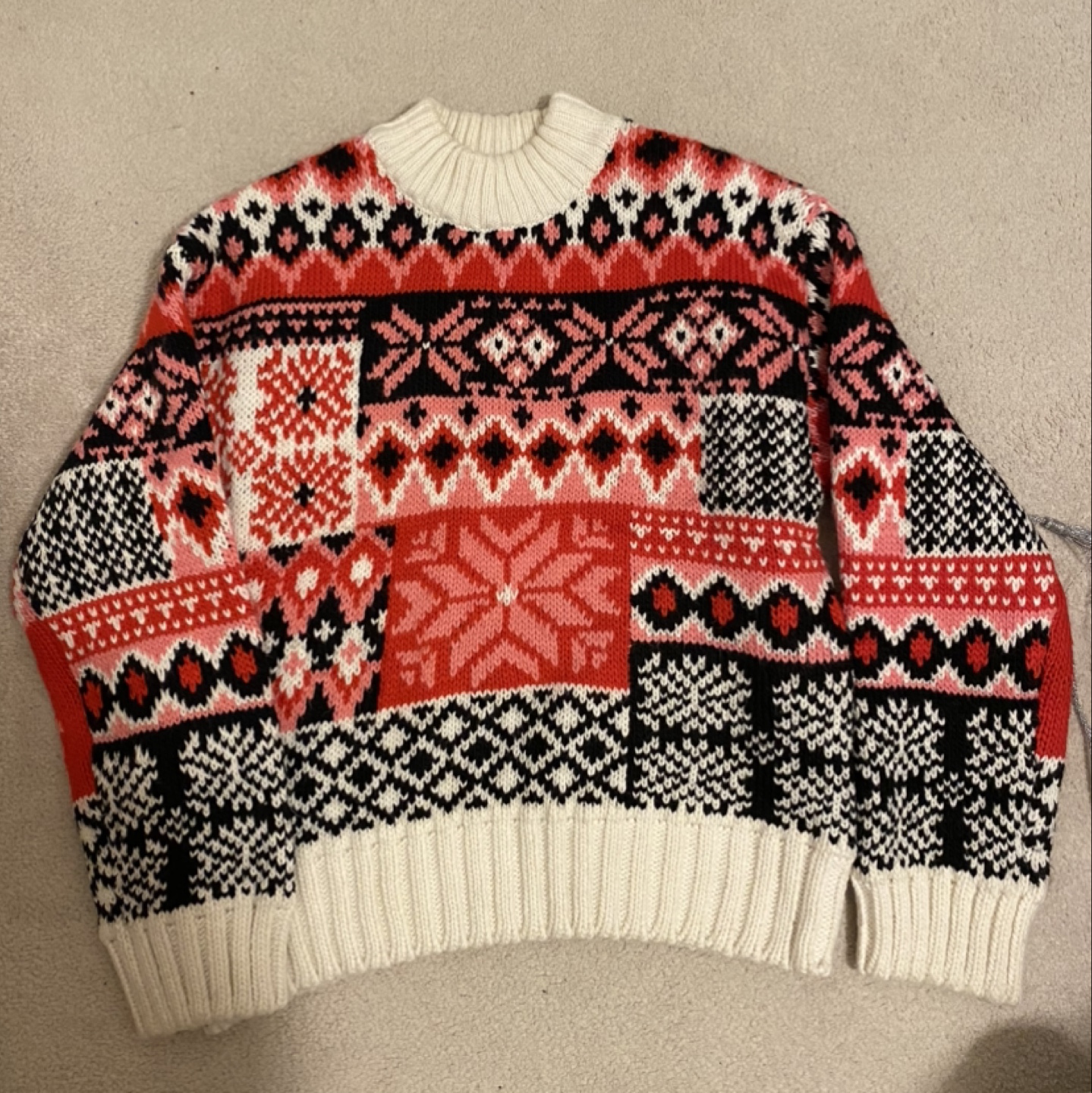 Oversized sweater in soft, jacquard-knit fabric. Dropped shoulders, long sleeves, and ribbing at neckline, cuffs, and hem. Worn once.