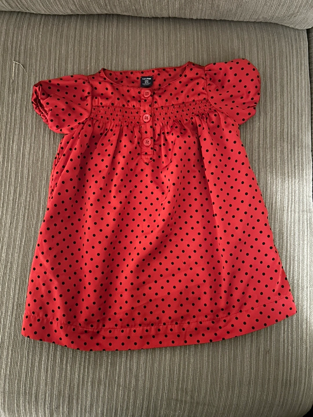 257Red polka dot dress with short sleeves and button up front. Size:18-24 Brand: baby gap