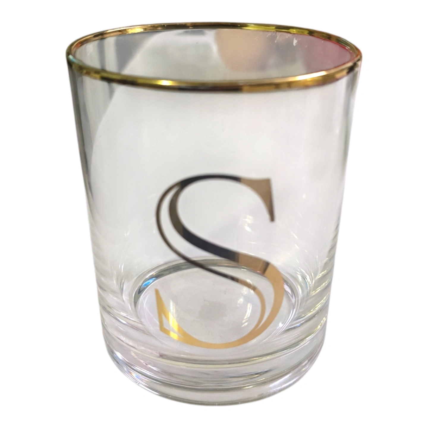 Monogram S in Gold Drinking Glass Great condition Elevate your drinking experience with this exquisite gold-rimmed glass, featuring an elegant 'S' monogram. The clear, high-quality glass is adorned with a sophisticated gold trim and a stylish 'S' design, perfect for personalized sipping or as a thoughtful gift. Versatile enough for various beverages, this luxurious tumbler adds a touch of class to any table setting or bar cart. 4" H x 3" diameter Tags: Monogrammed Drinking Glass, Gold Rim Tumbler, Personalized Glassware, Luxury Barware, Elegant 'S' Glass, Custom Cocktail Glass, Gold Accent Drinkware, Personalized Gift, High-End Glassware, Monogram Whiskey Glass, Stylish Bar Accessories, Wedding Gift Glass, Customized Drinkware, Gold Trimmed Tumbler, Sophisticated Barware
