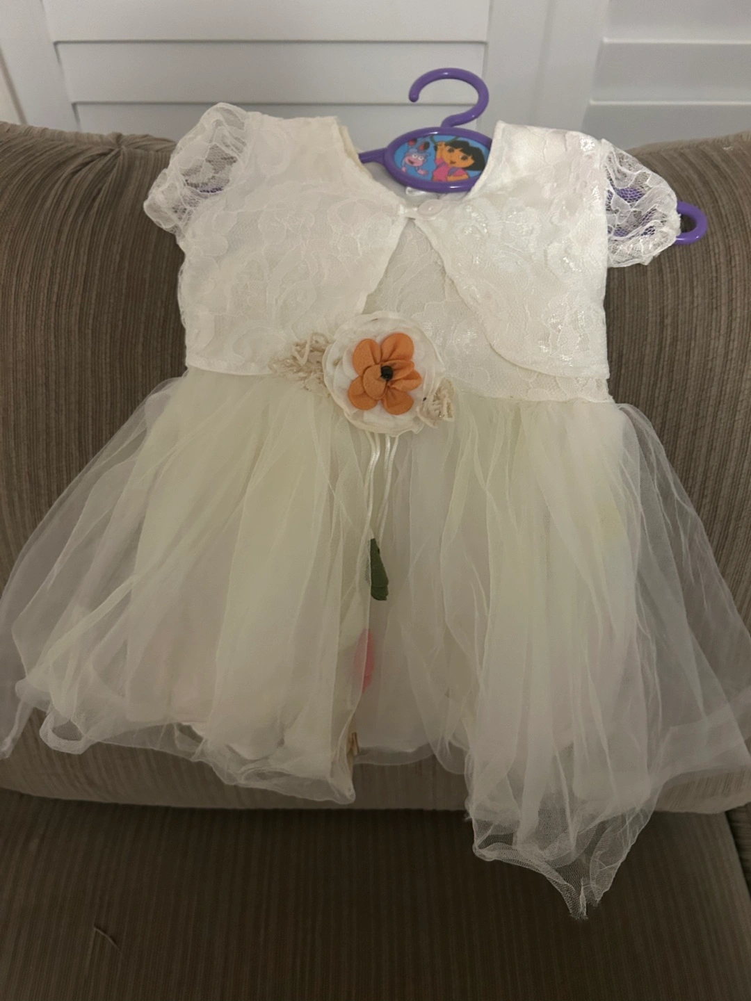 White tulle dress with lace overlay. Includes matching lace bolero. Has flower embellishment on the waist.