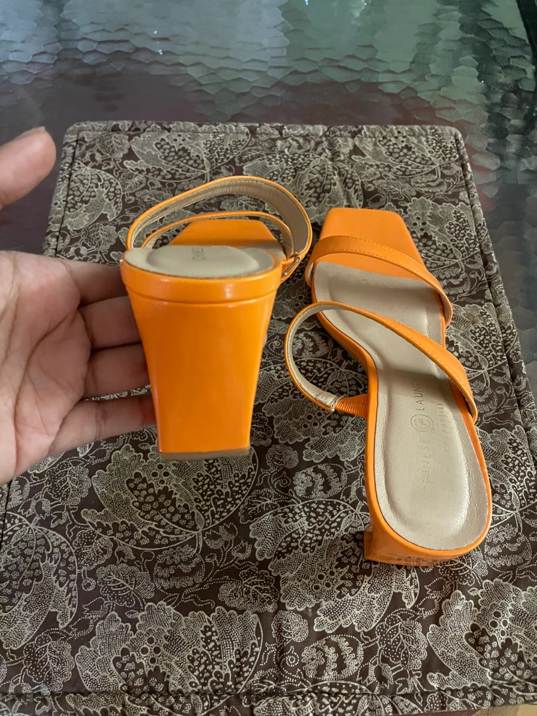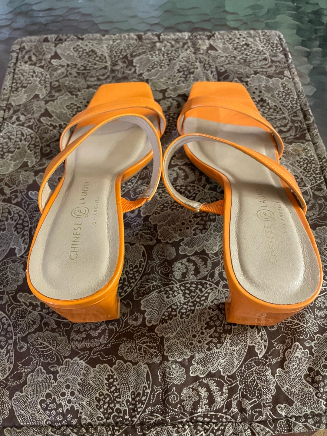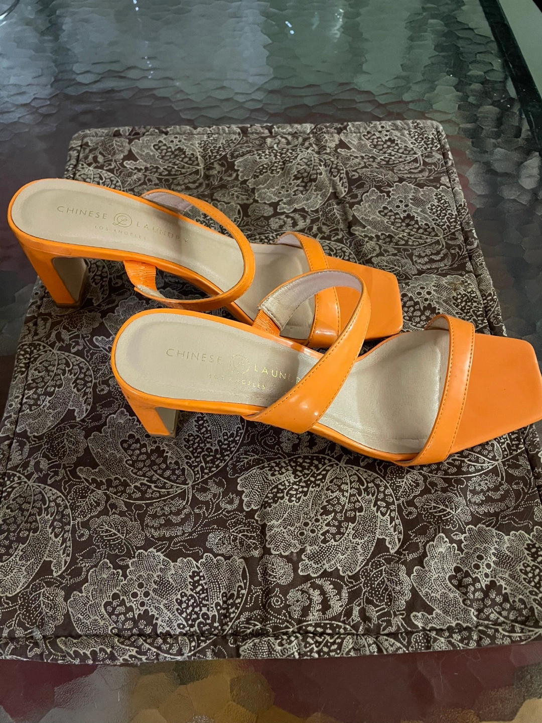 Orange heeled sandals with two straps. Square-toe. Lightly worn, like new condition! Size 8.5