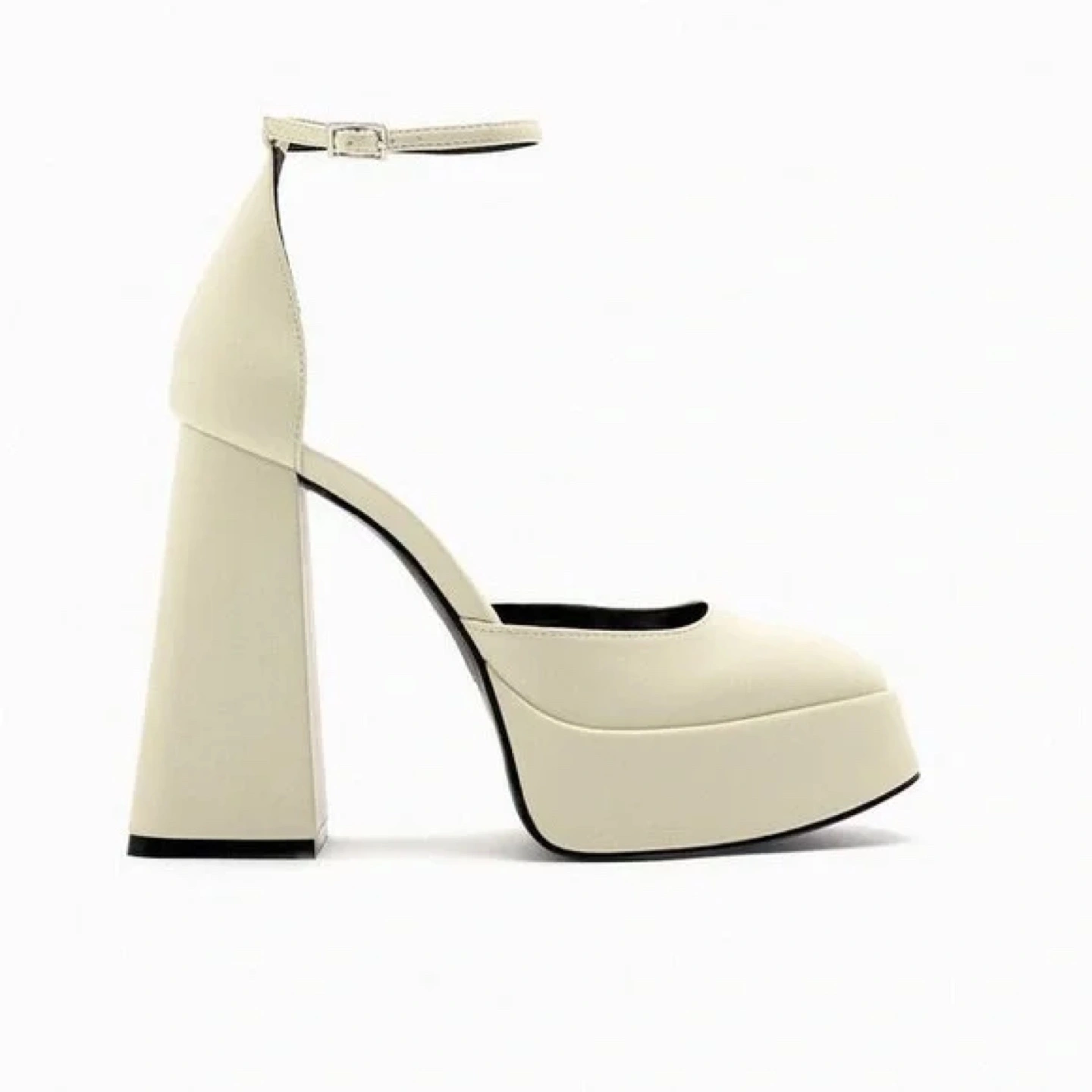 Zara Cream Chunky High Heel Platform Shoes. Buckled strap closure at ankle. Heel height: 5.1 inches (13 cm). AIRFIT®. Flexible technical sole made of latex foam designed to offer increased comfort. Size 10.