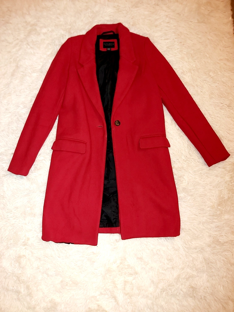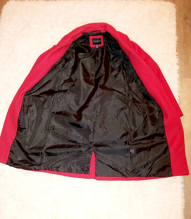 Red longline wool coat with a single button closure and pockets. Lined with black fabric. worn only once.