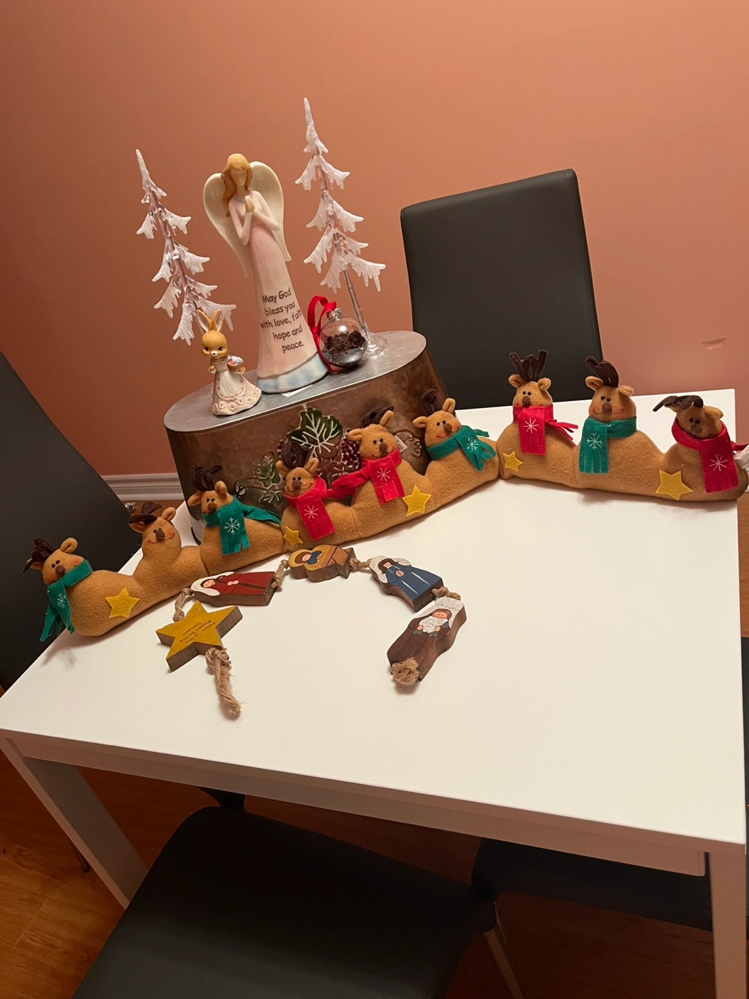 Reindeer garland with a green and red scarf. Includes small wooden figures of the nativity scene. Rabbit and Angel, 2 clear frosted trees. Potpourri tree ornament.