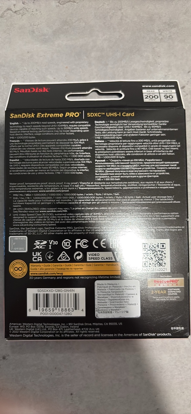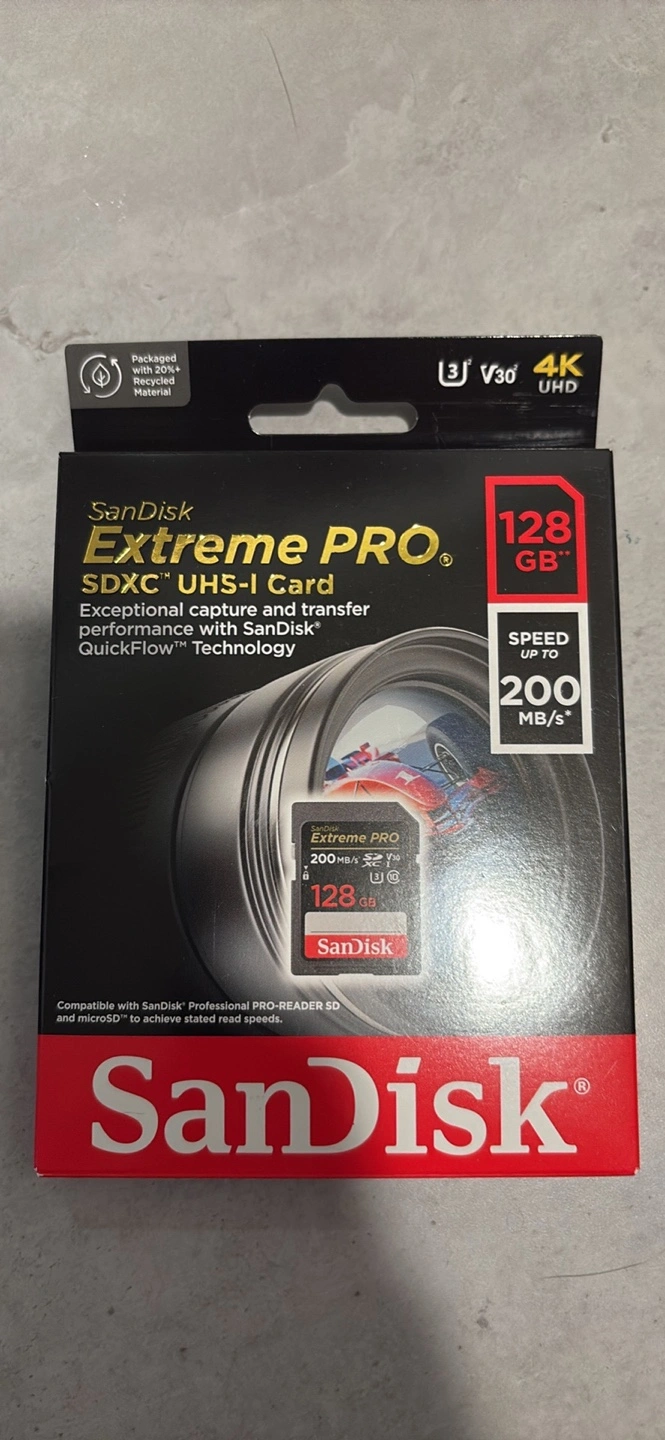 128GB SDXC memory card. Up to 200MB/s read speeds. Designed with professional photographers and videographers in mind. Includes SanDisk QuickFlow technology. 4K