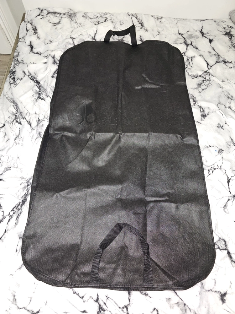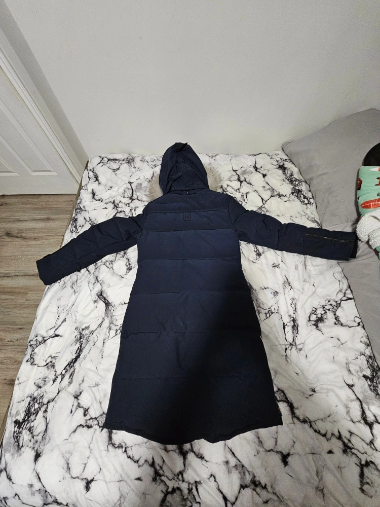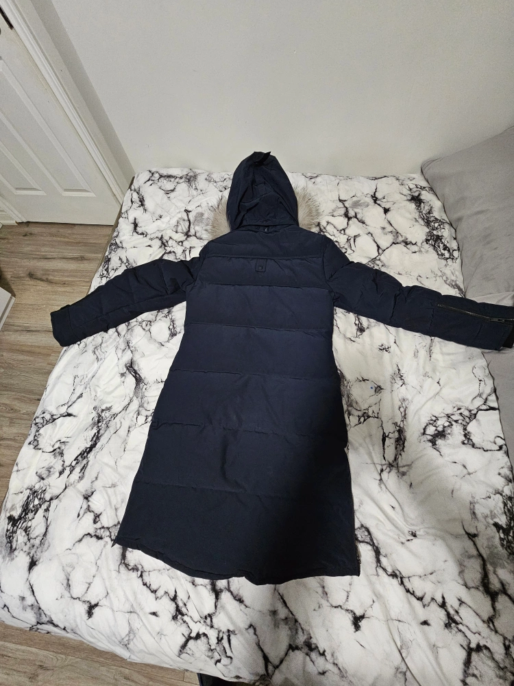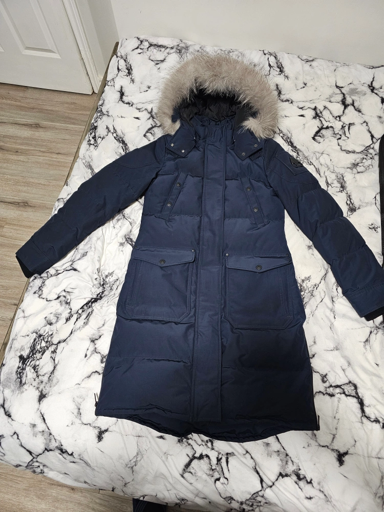 Long navy blue parka with a fur-lined hood. Features two front pockets and a large pocket on the left sleeve. Comes with a garment bag.