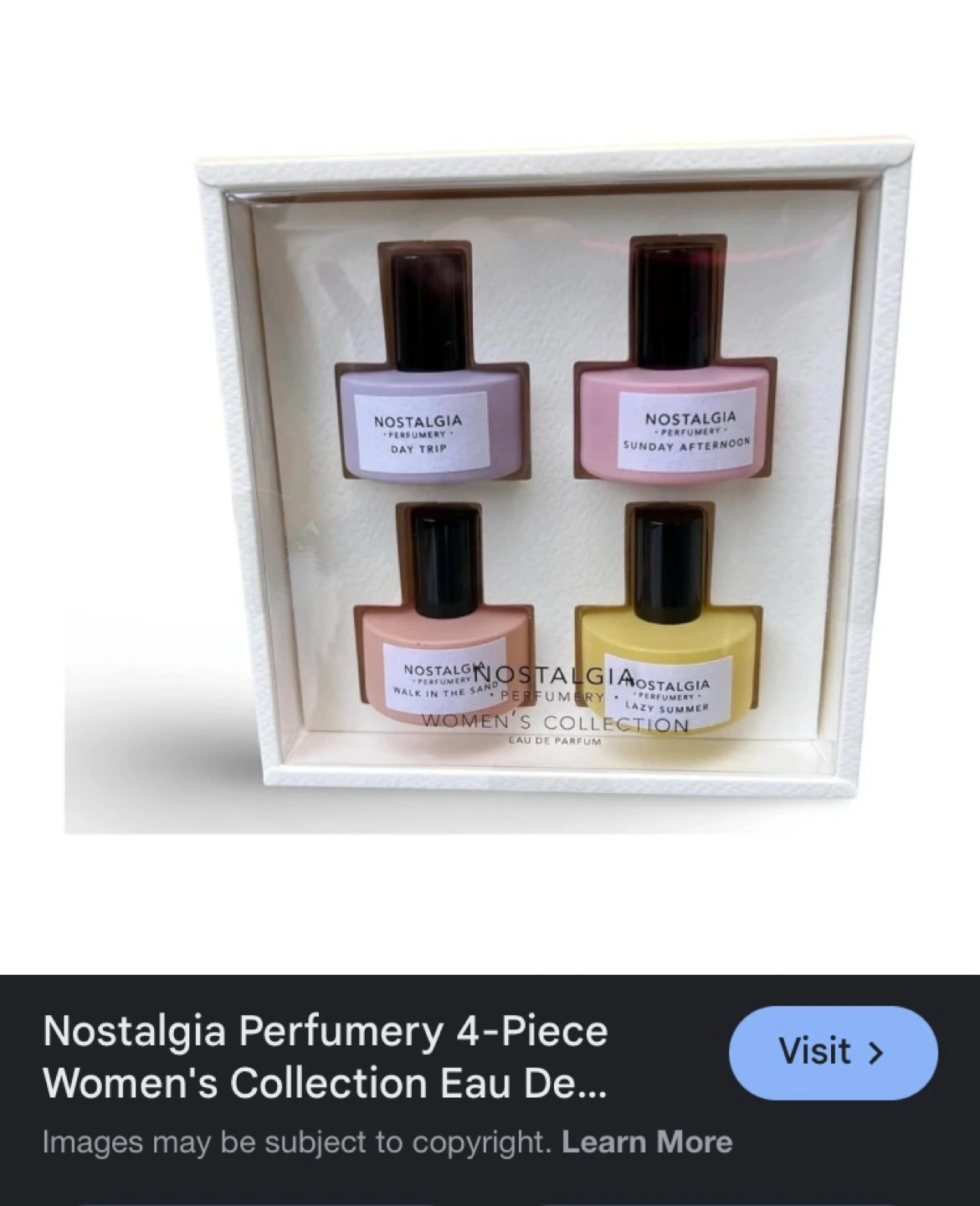 Women’s perfume bottles in a gift box. The scents include: Day Trip, Sunday Afternoon, Walk in the Sand, and Lazy Summer.
