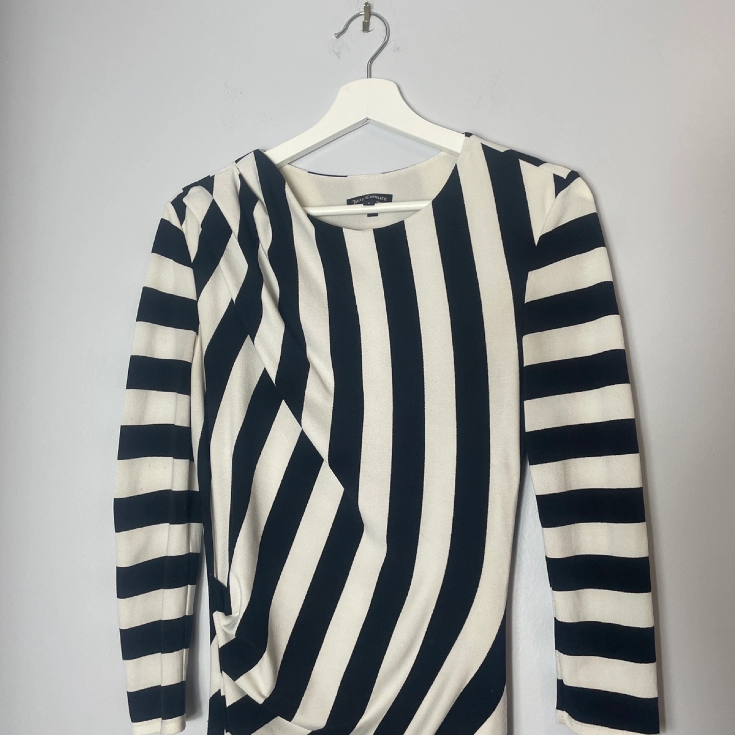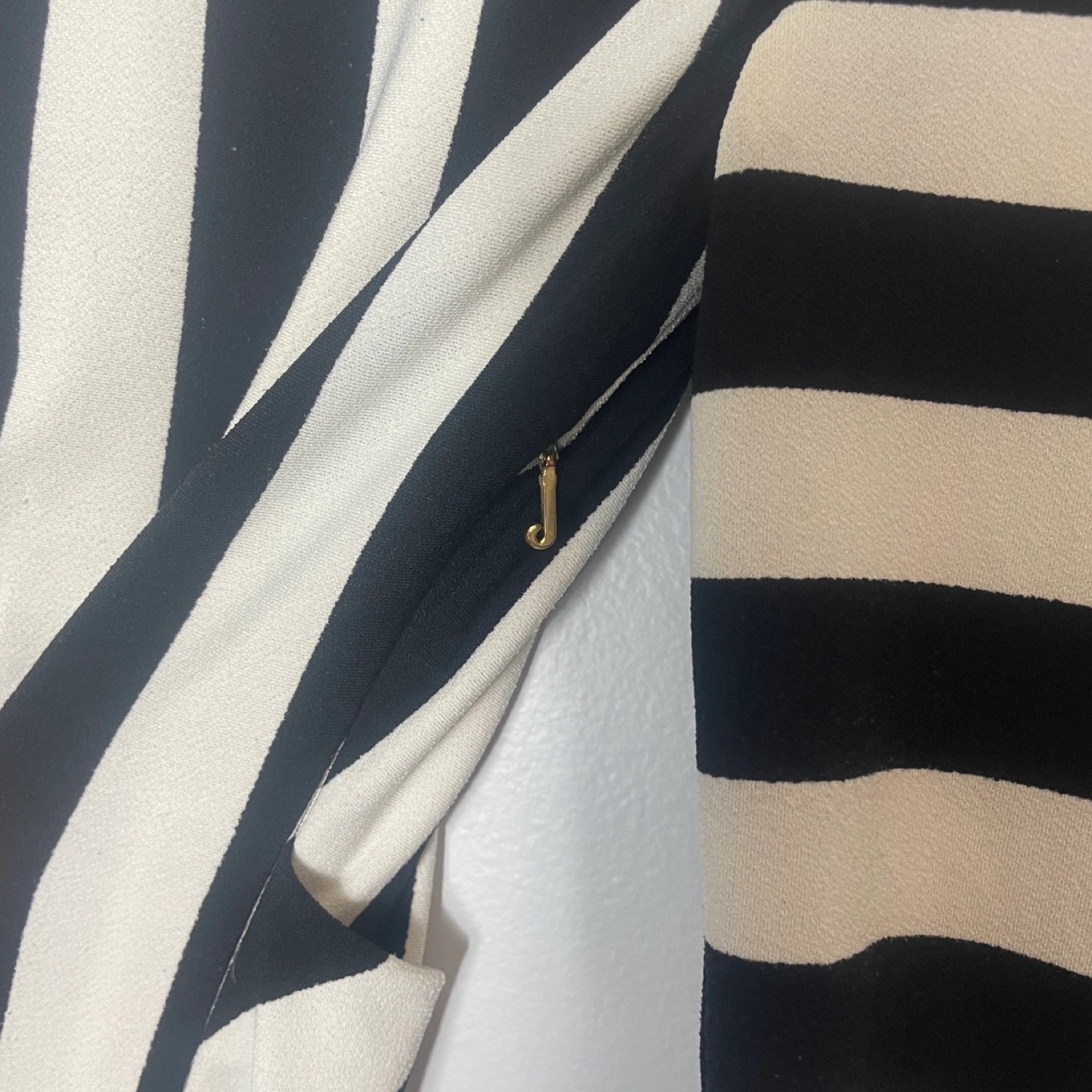 Juicy Couture Promenade Stripe ¾ Sleeve Dress Size Small Great worn condition Colour: Black & Angel White Self: 96% poly, 4% elastane.Lining: 95% poly, 5% elastane. Fully lined. Pleated shoulder detail. Ruched, draped fabric. Side seam zipper closure with the iconic gold J zipper under the left arm. Striped pattern. Length: 37" approx Pit to pit, front: 16" approx Waist: 26" approx More measurements available upon request. Styles: y2k 00’s striped print ruched