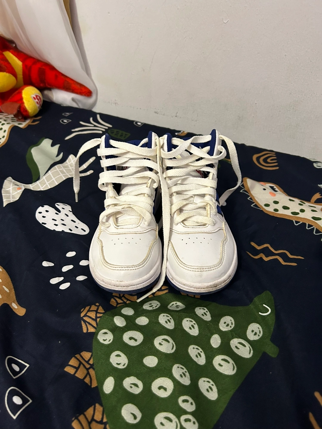 White high top adidas sneakers with blue and red accents. Lace-up closure. Hardly worn, in excellent condition only serious enquires please.