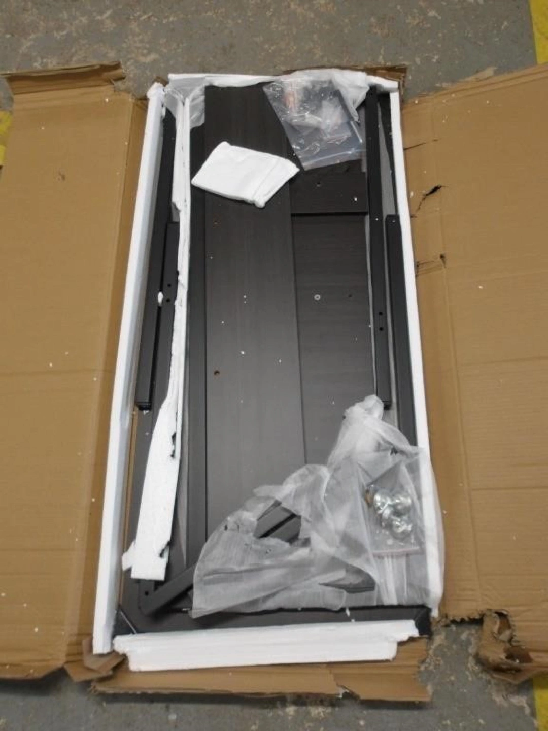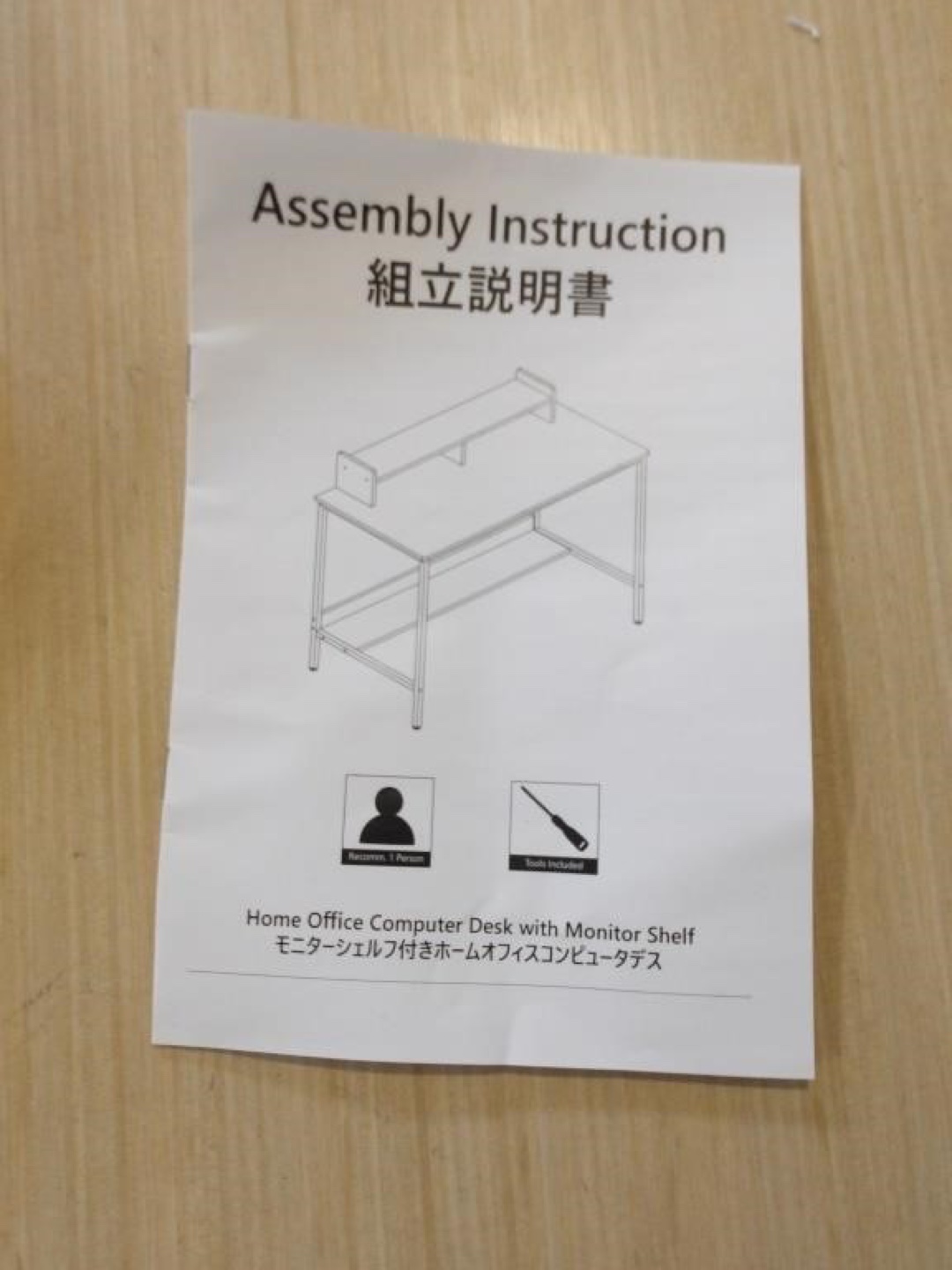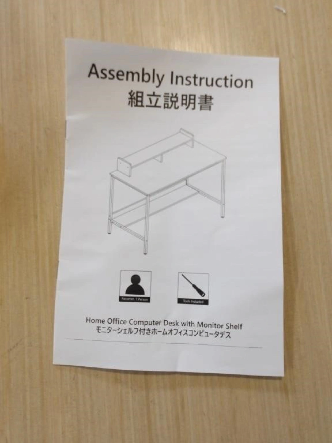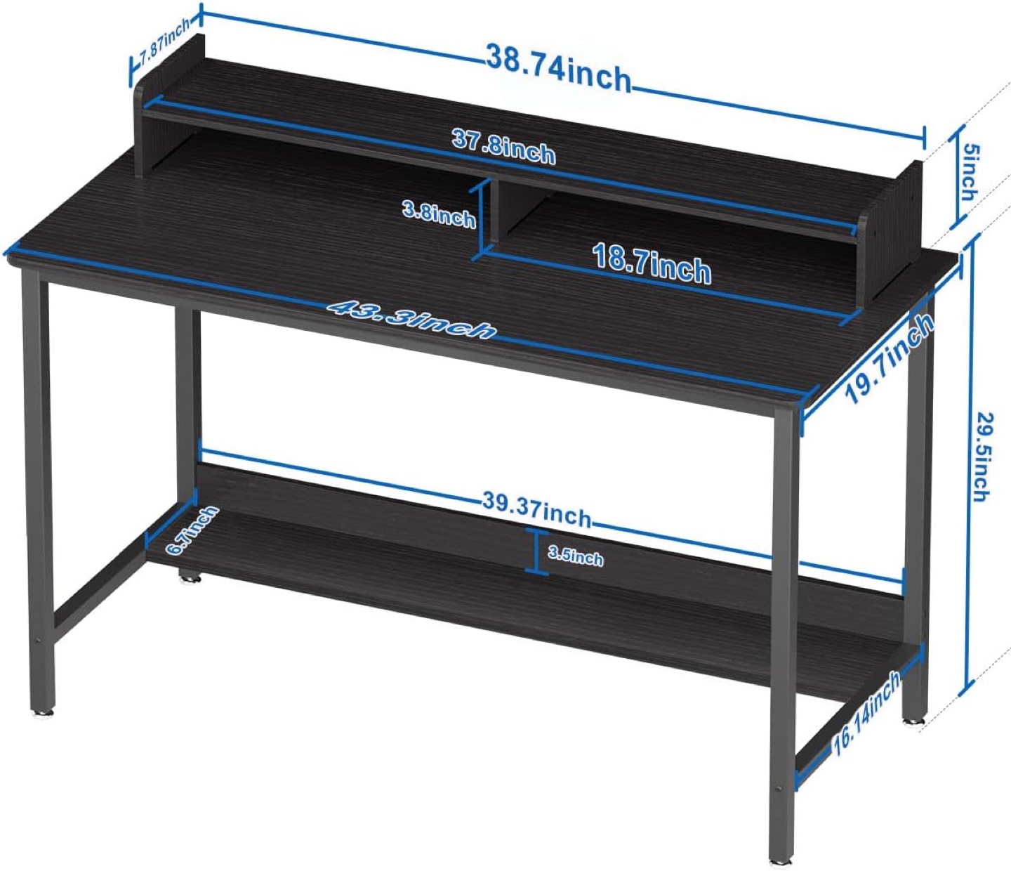Black computer desk with monitor shelf and bottom shelf. Includes hardware and assembly instructions.