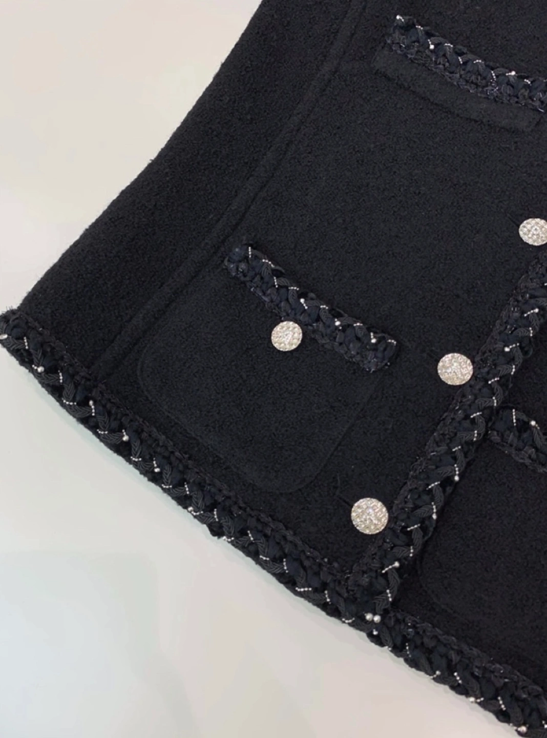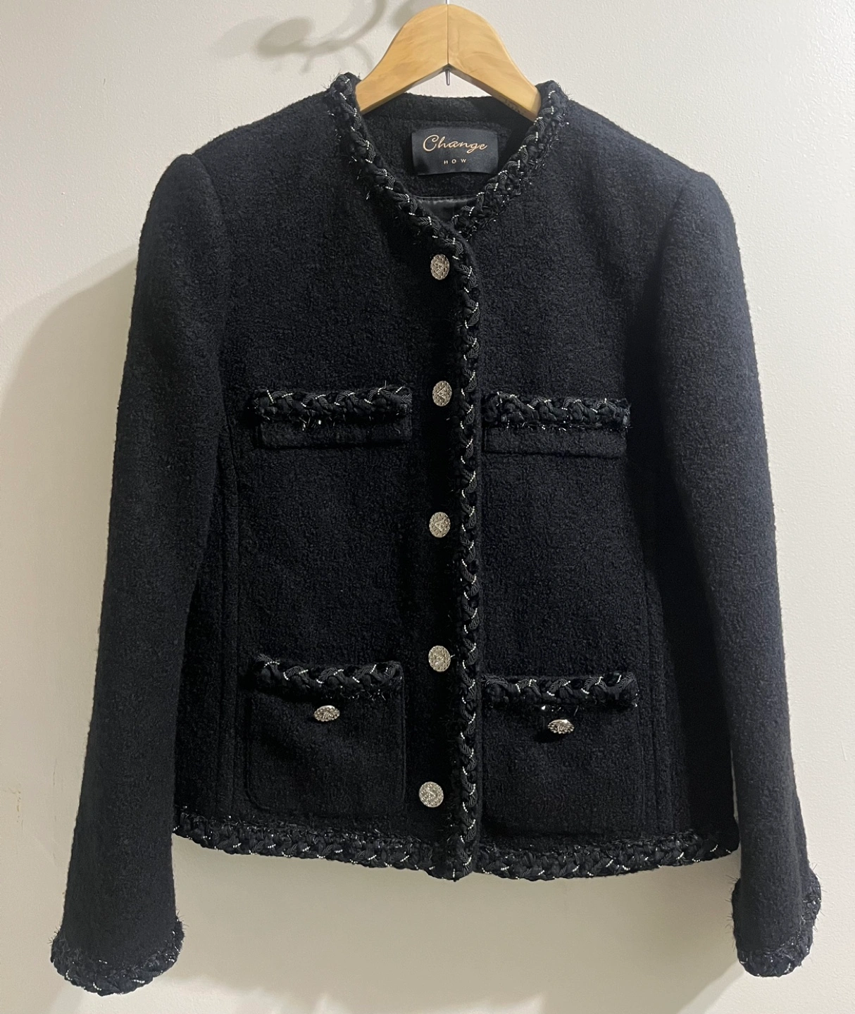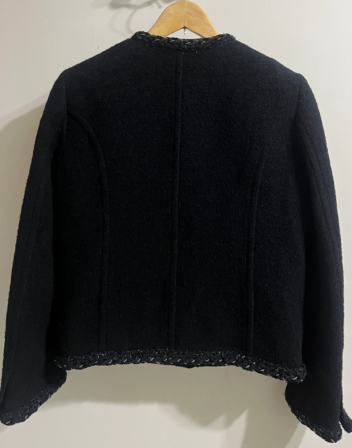 Black tweed jacket with delicate buttons. Features a braided trim on the collar, pockets, and hem.