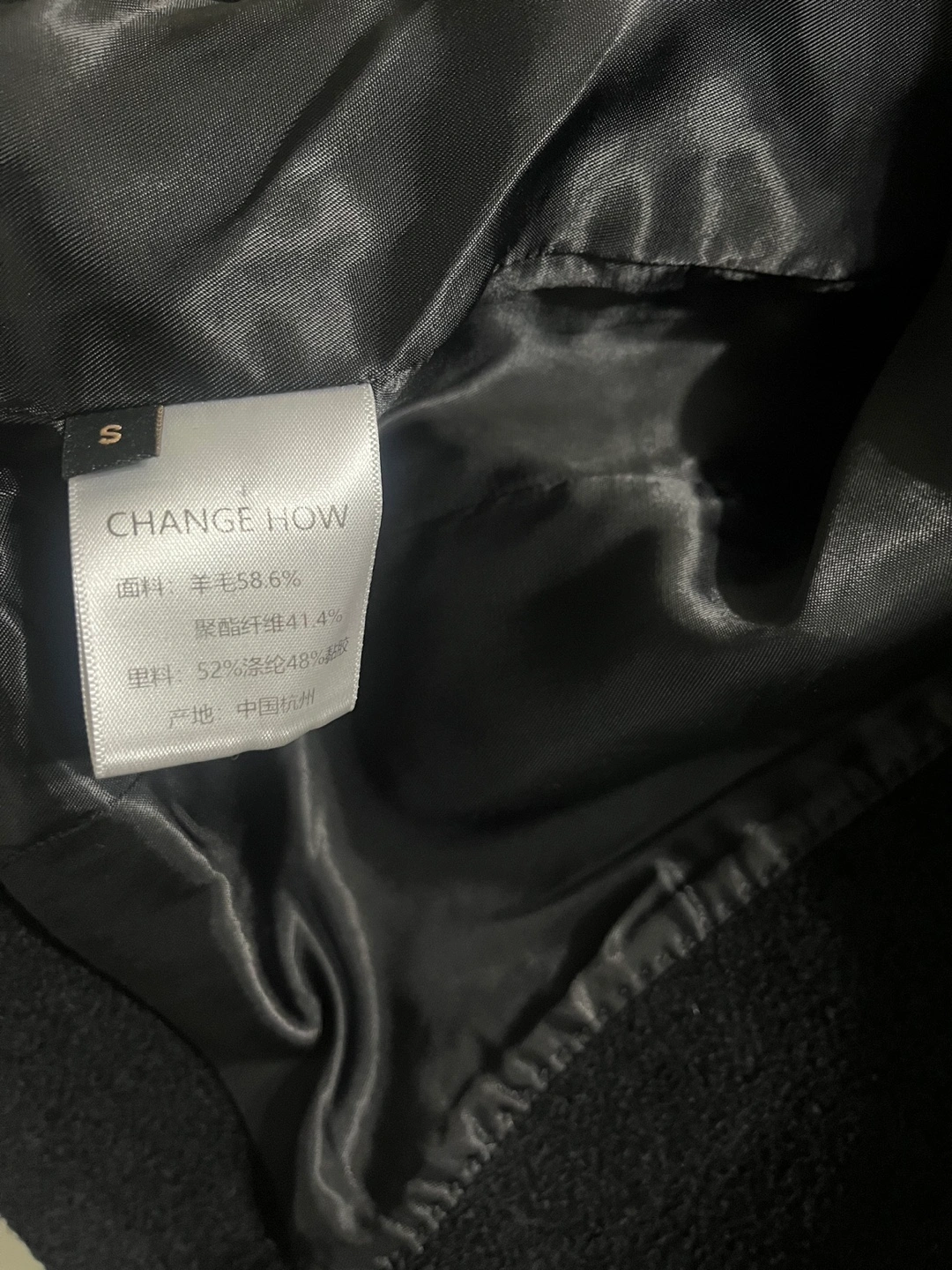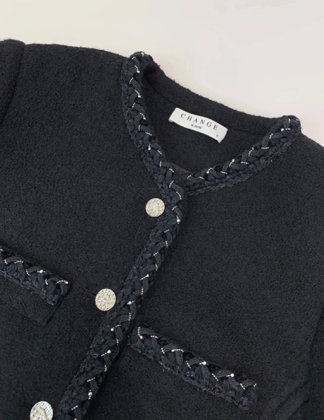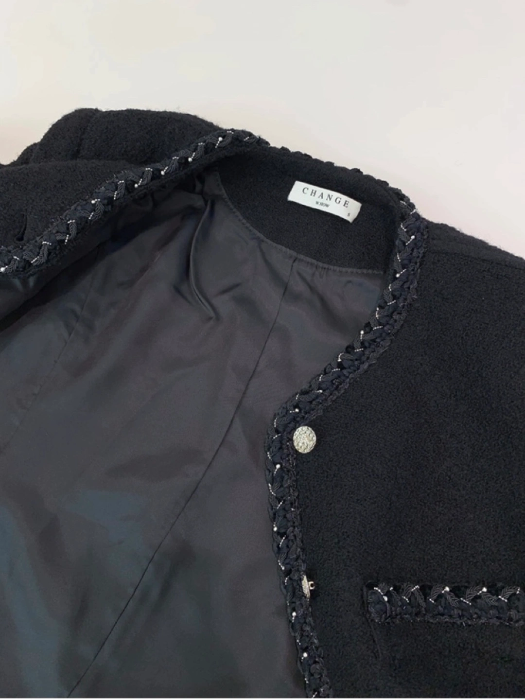 Black tweed jacket with delicate buttons. Features a braided trim on the collar, pockets, and hem.