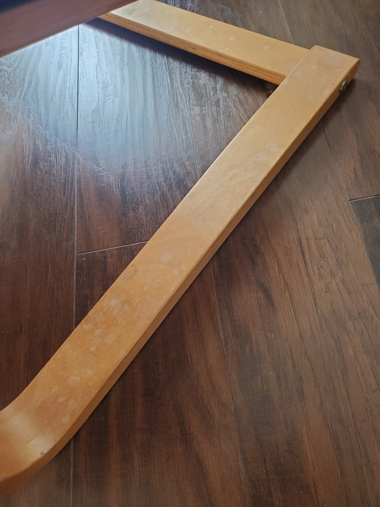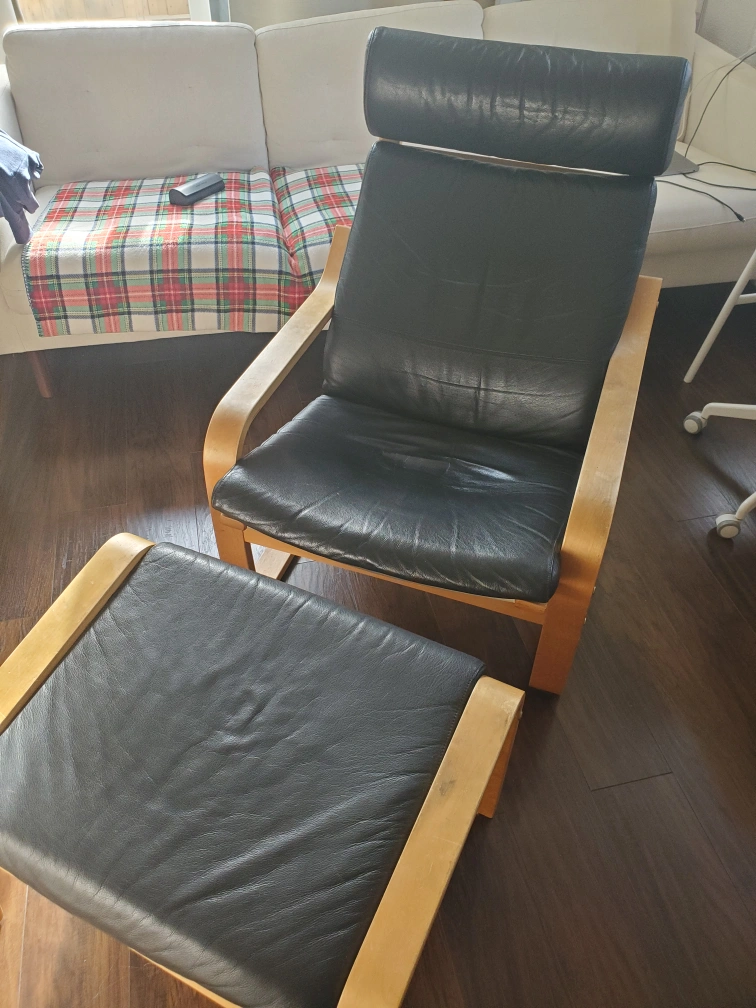 A classic design, IKEA Poang black leather chair. Have had it for a while so it has some discoloration and dents. Easy to keep clean fake leather.