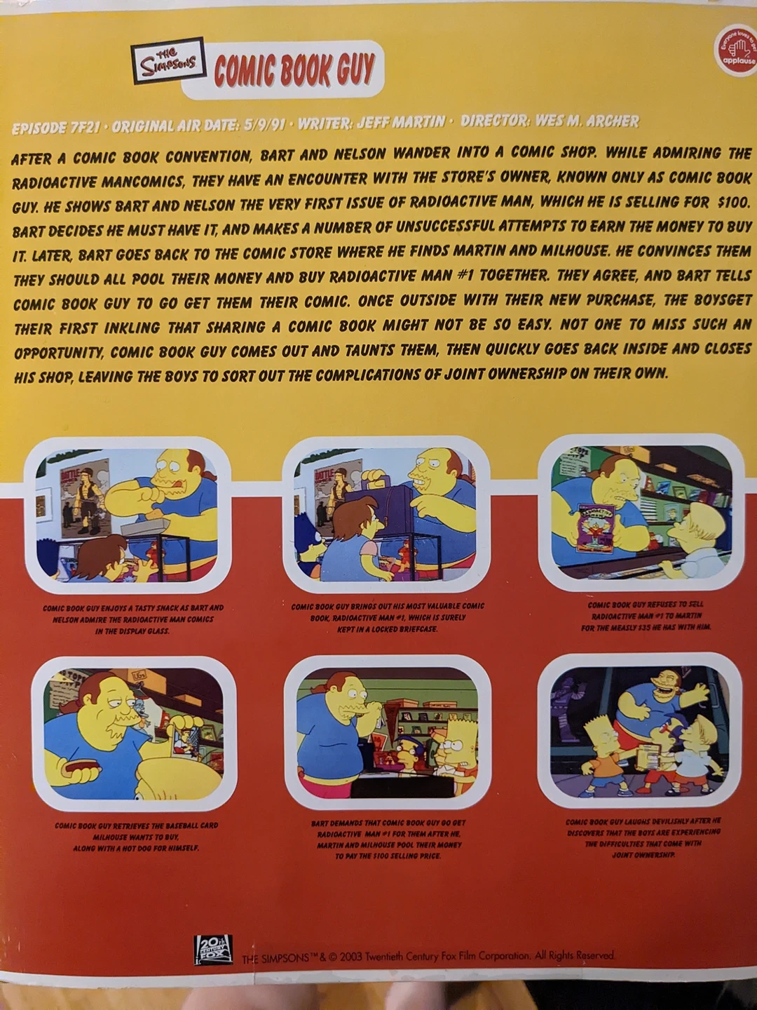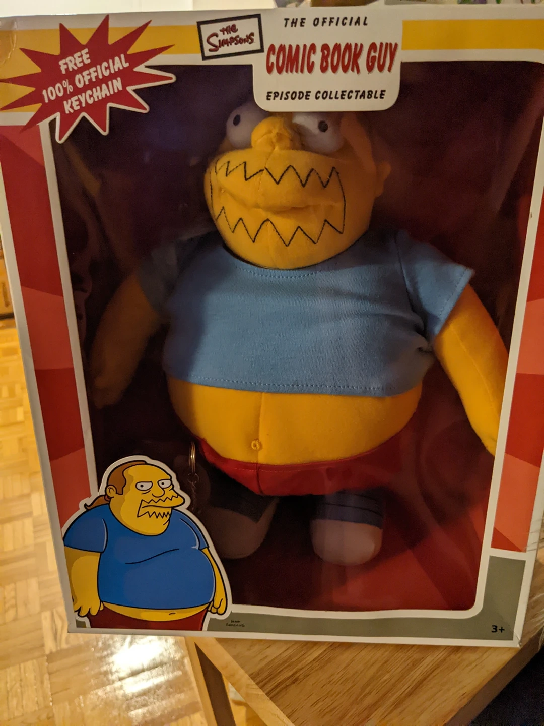 Comic Book Guy plush toy (2003). 12" tall. BNIB. Box has some wear in top-left corner, but otherwise is in good shape. Toy is unused and in new condition.