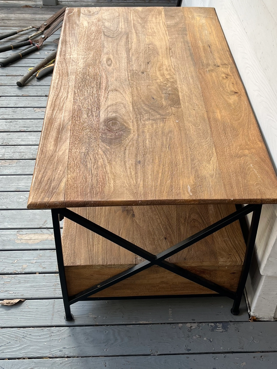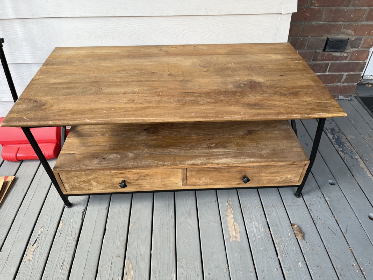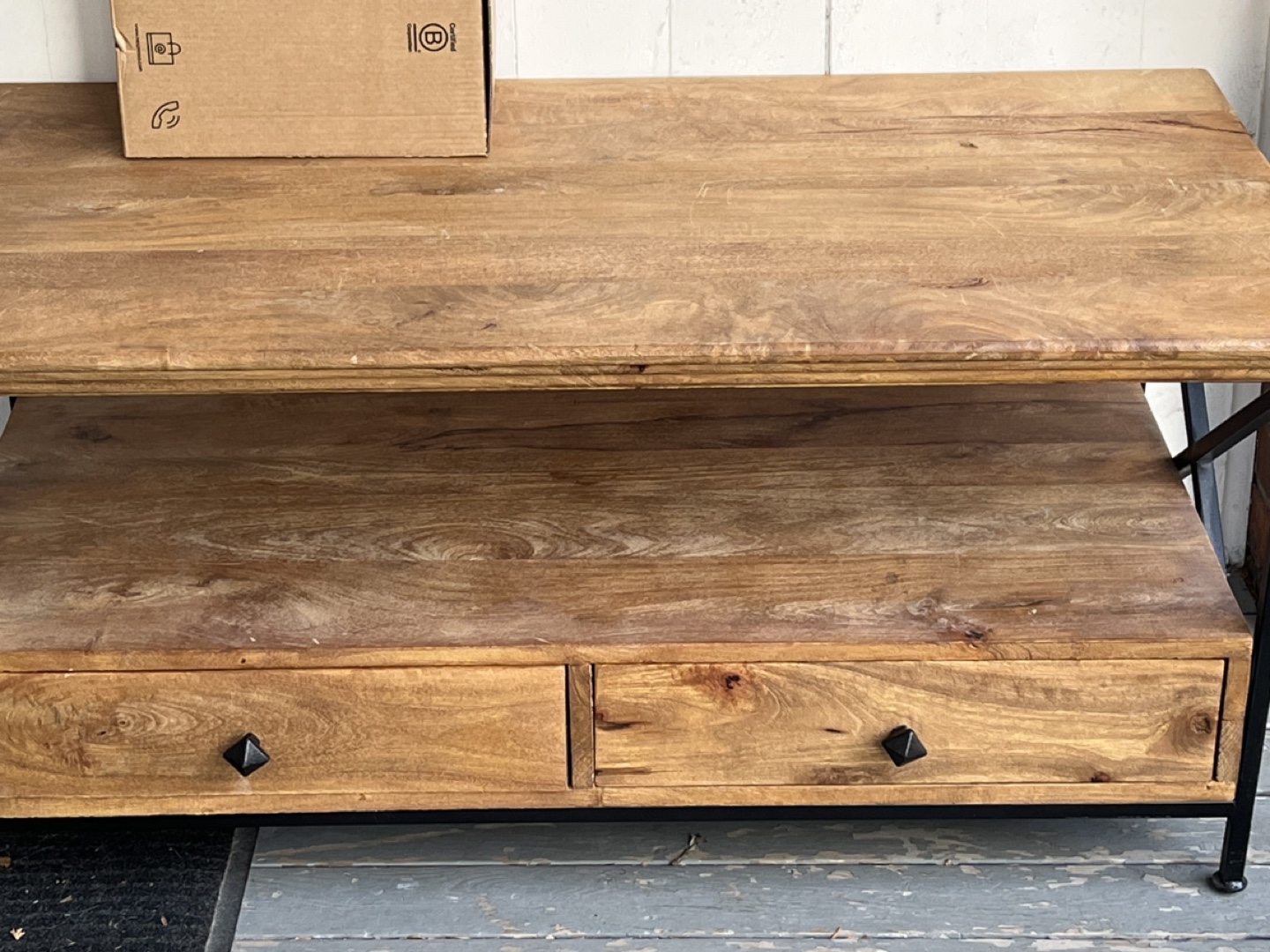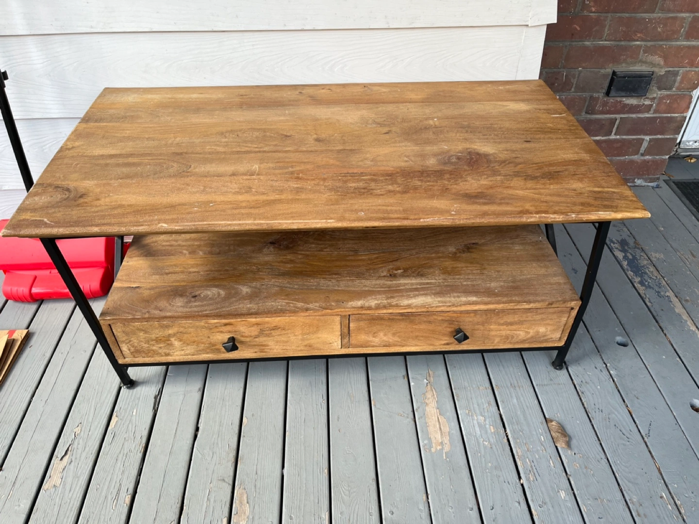 1 Coffee table with two drawers and an open shelf. Made of wood and metal.