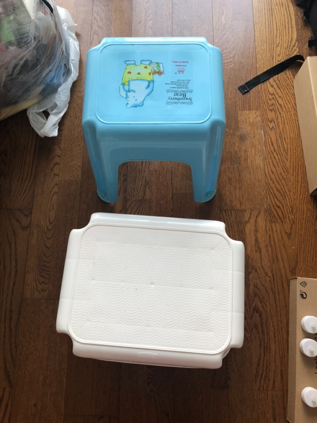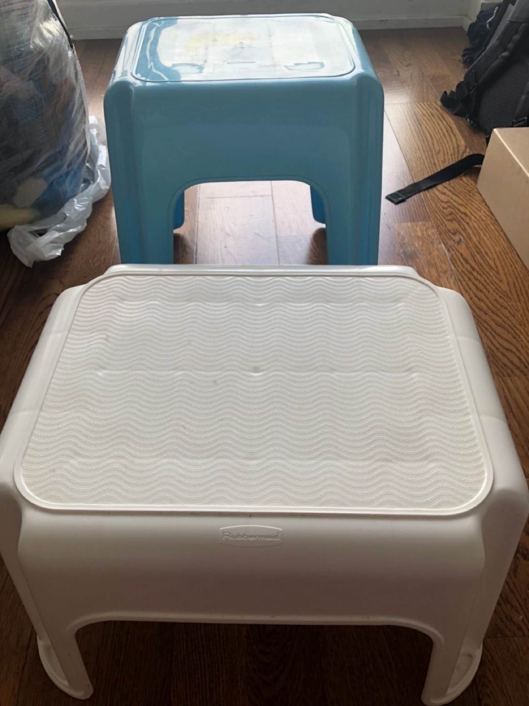 Two plastic stools, one white and one blue. Both are in excellent condition and have no damages. White stool is very sturdy and withstand a lot of weight.