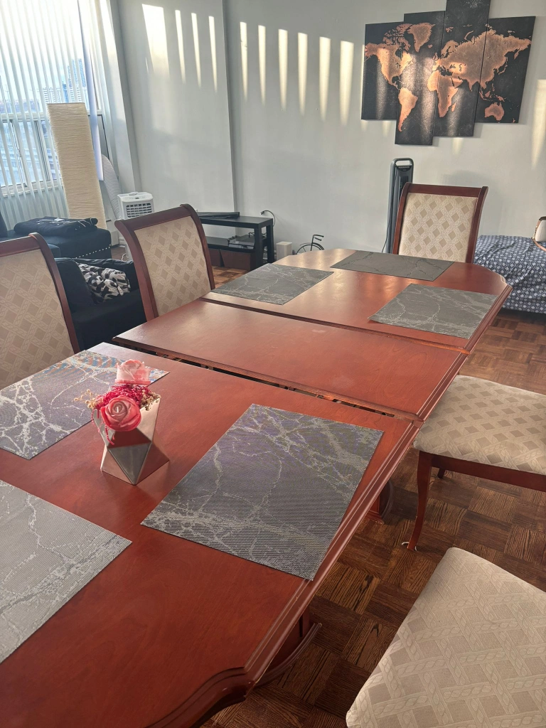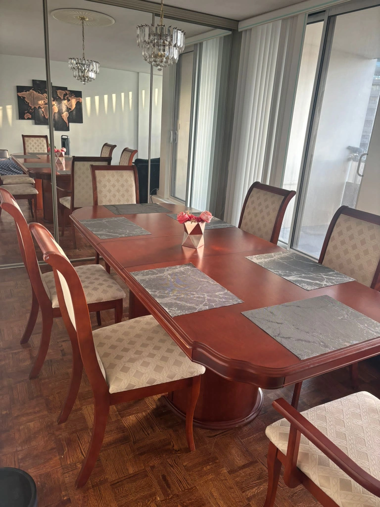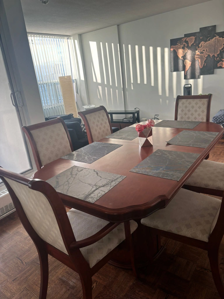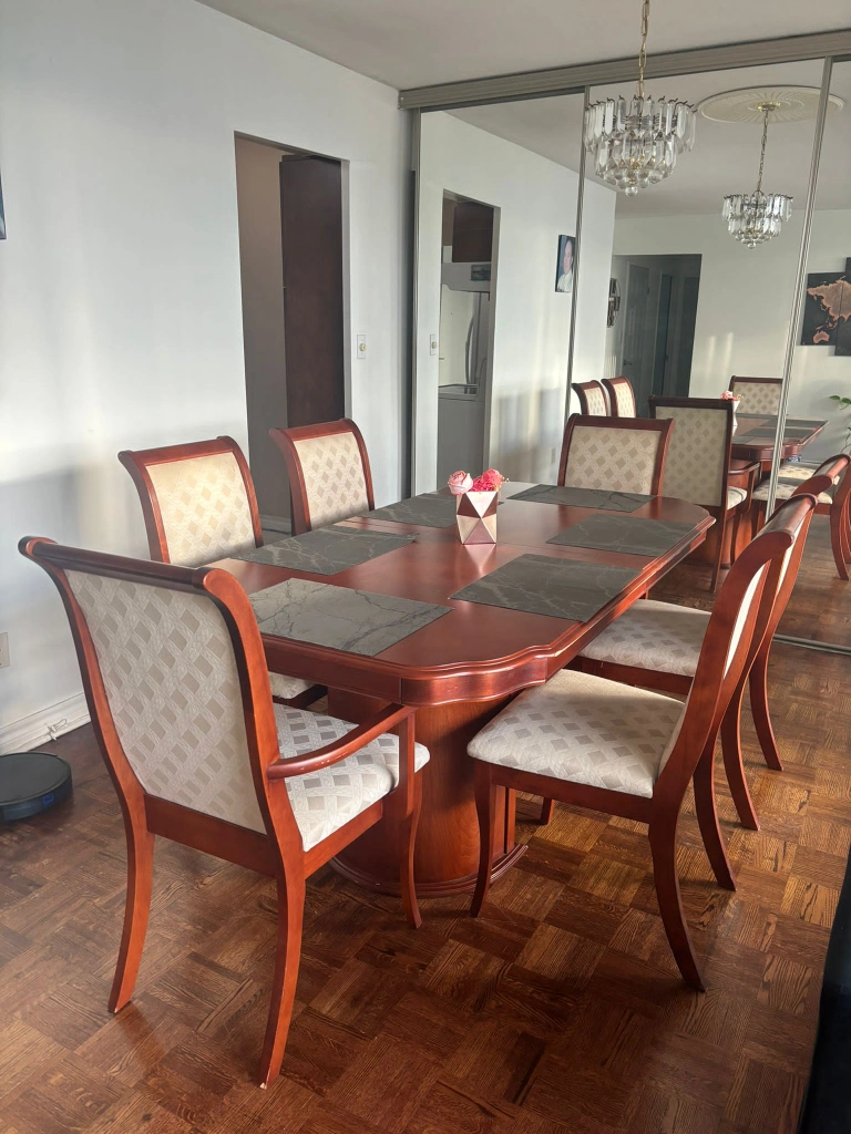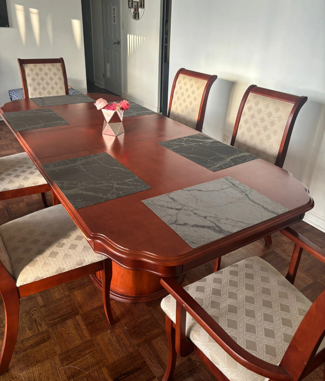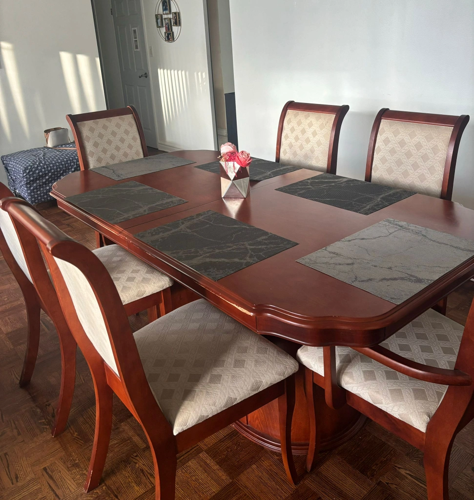 - **Comfortable Seating:** Accompanied by six matching chairs, each designed for comfort and support, ensuring that everyone can enjoy long meals and lively conversations.