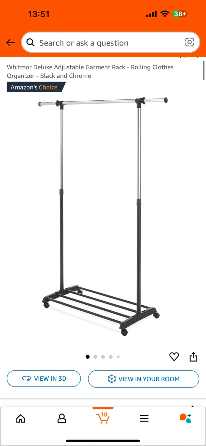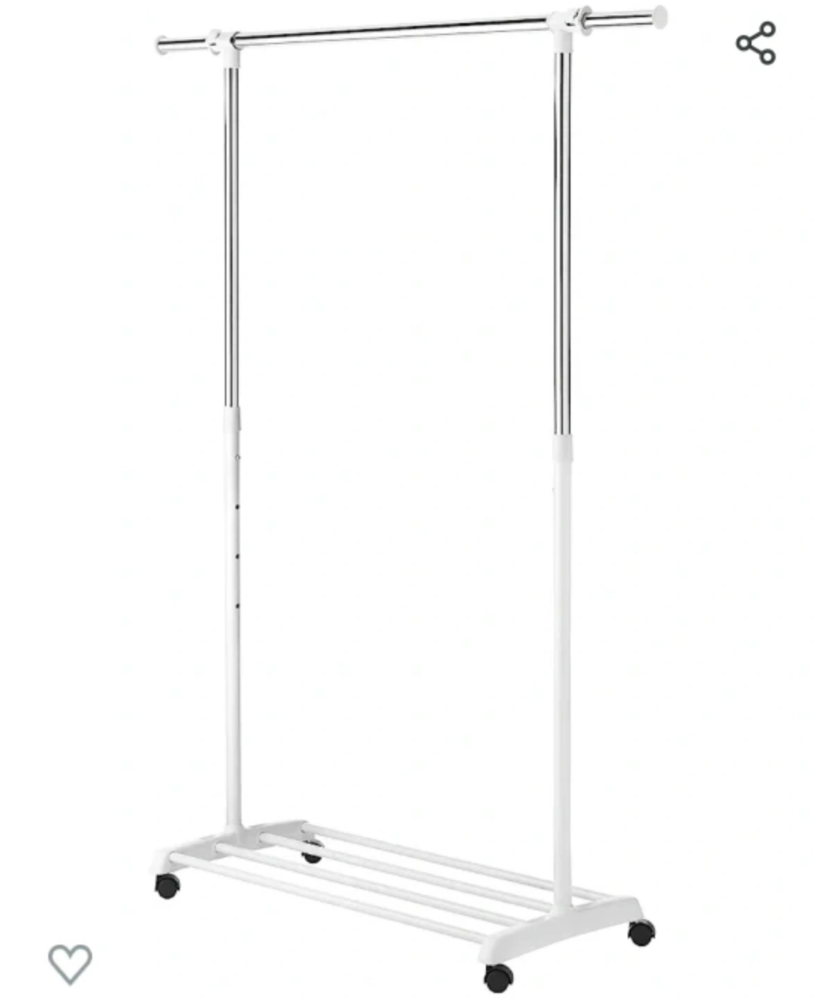 Adjustable rack with wheels. Chrome and white. both the height and the length of the bar are adjustable