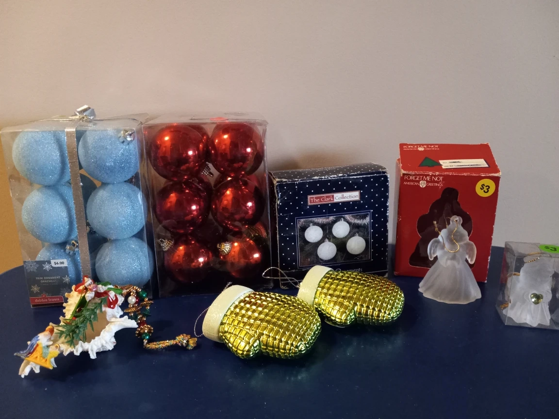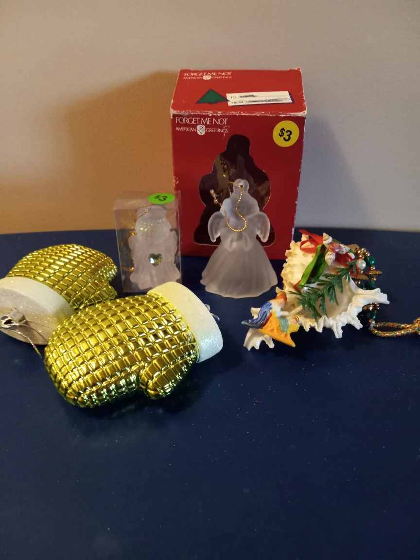 Any assorted item packages at $5 each. Blue frosted ornaments by Martha Stewart at $10. Two gold mittens ornaments at $5 for both. Glass angel ornaments at $3 each. Please see individual photos.