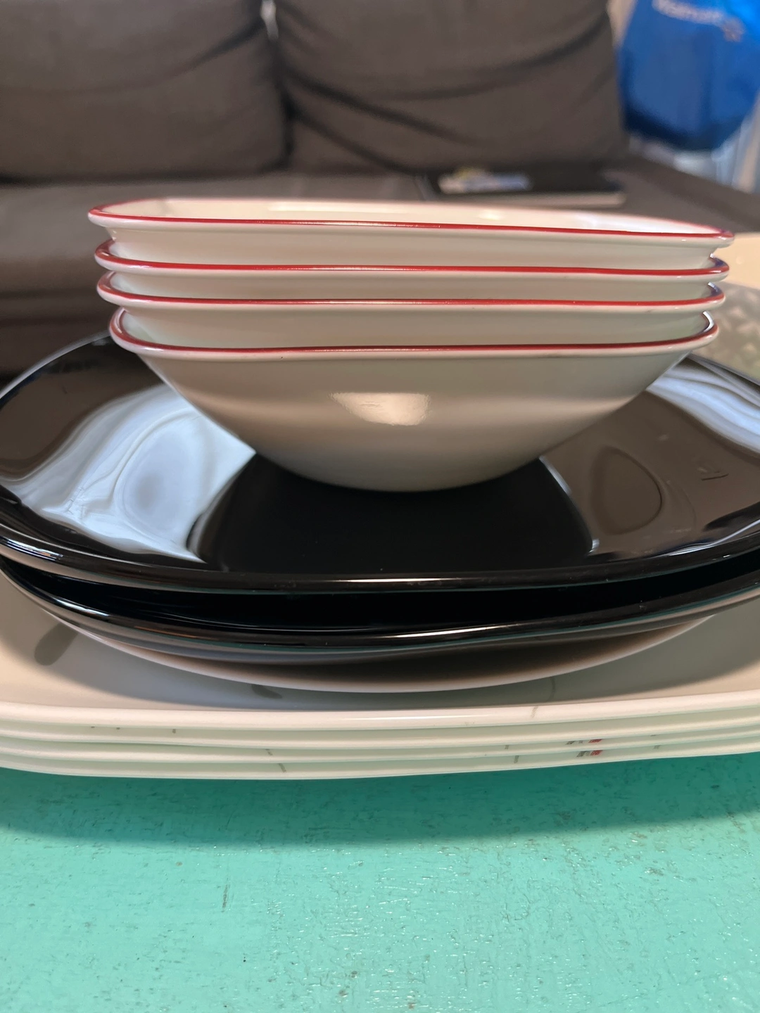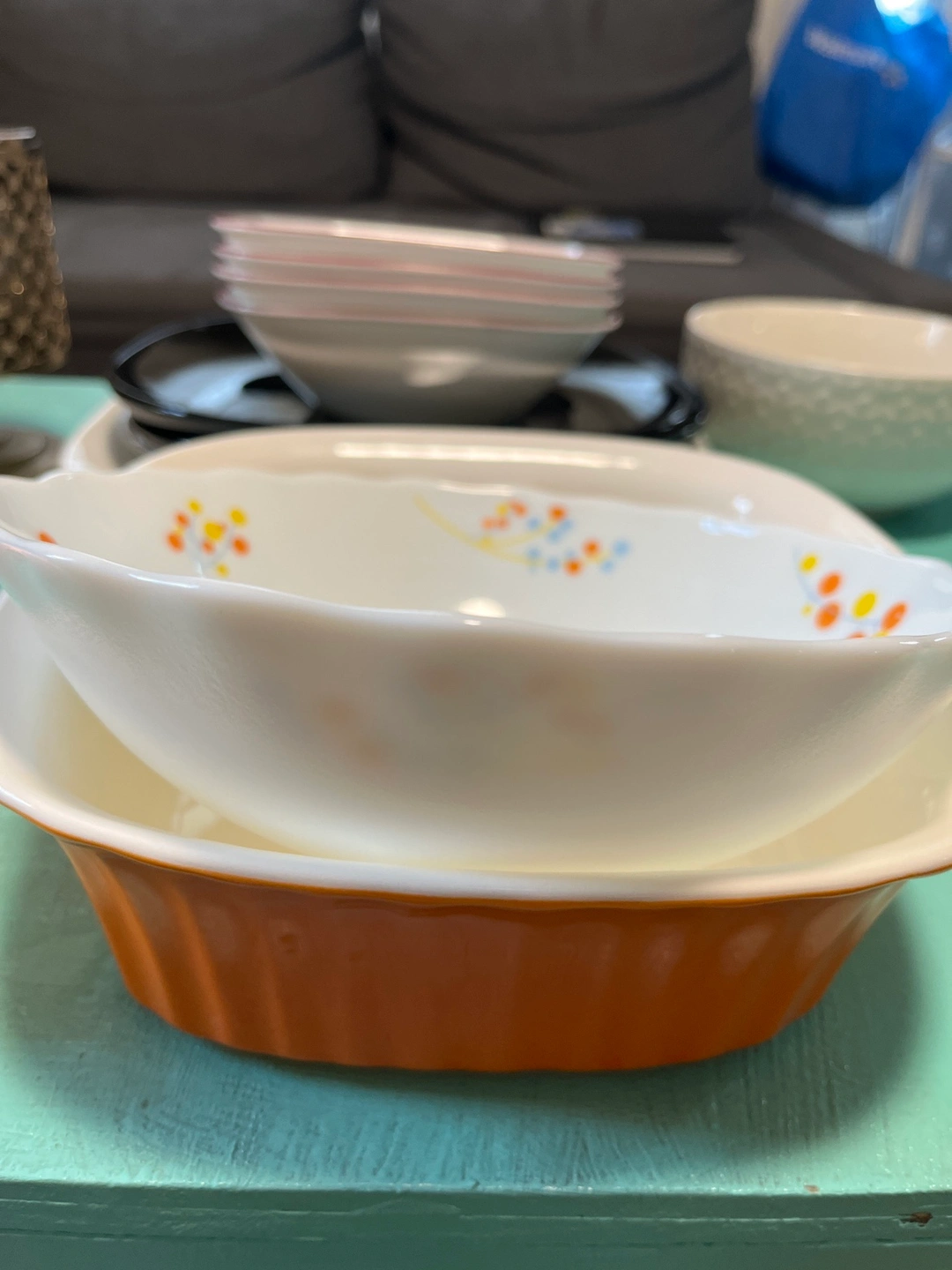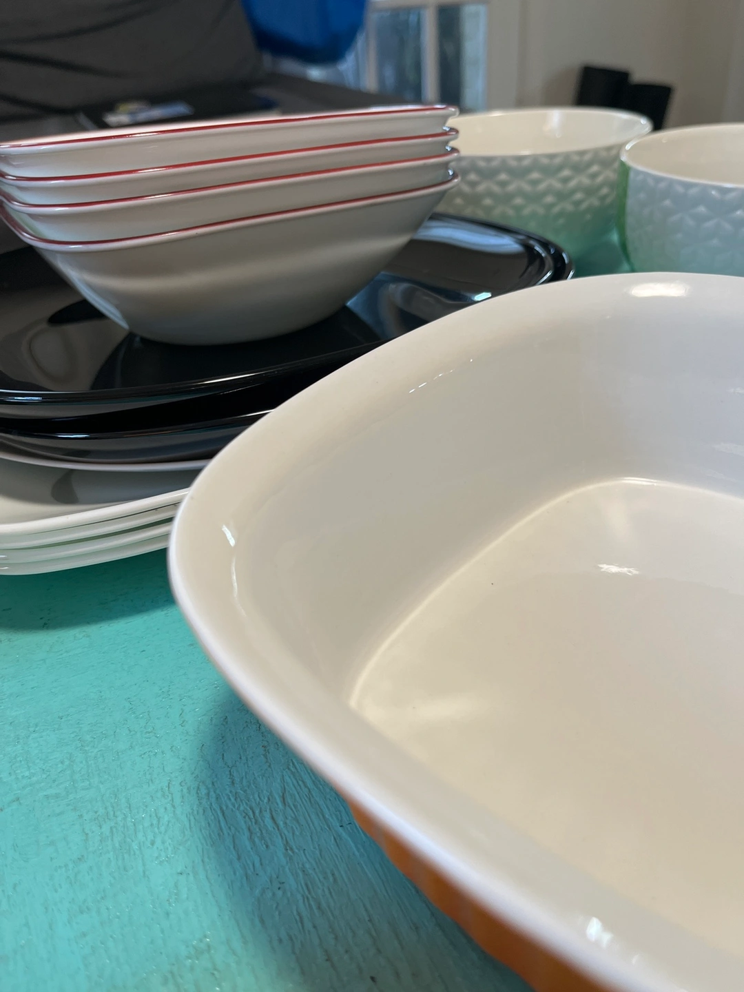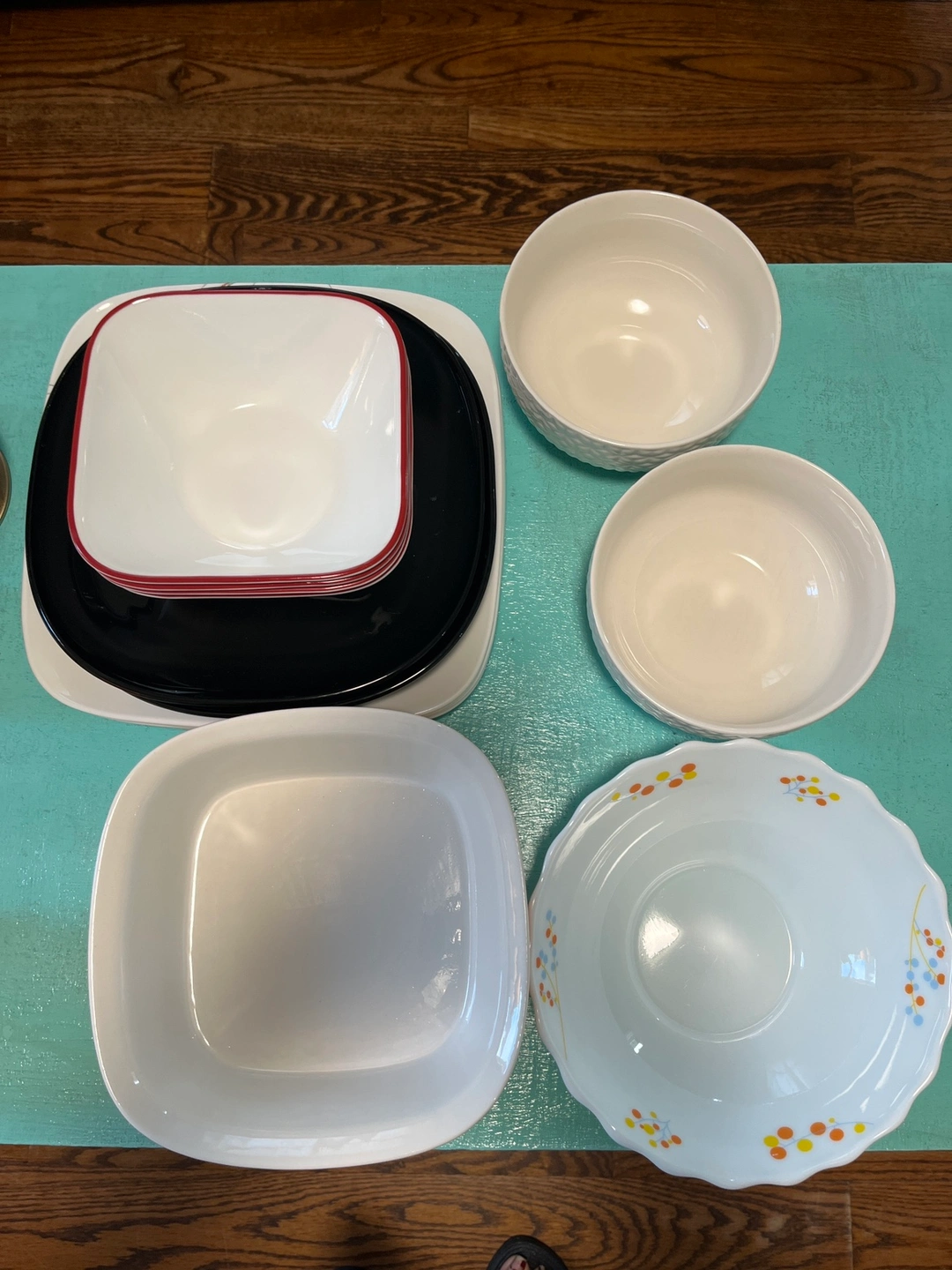Set of Over and Back dinnerware. Includes square bowls, plates, and a large baking dish.Corelle dinner plates 4 and 4 big bowls.