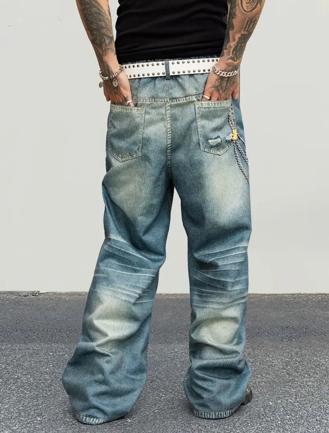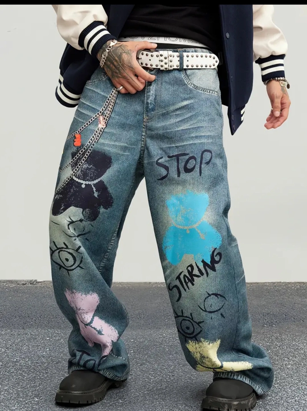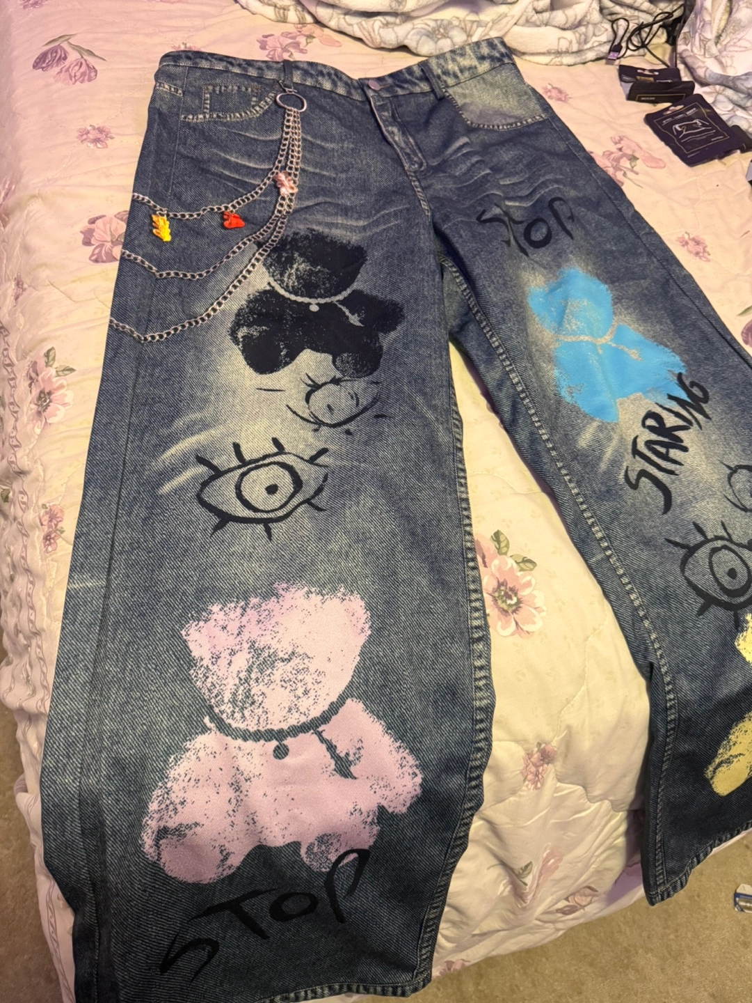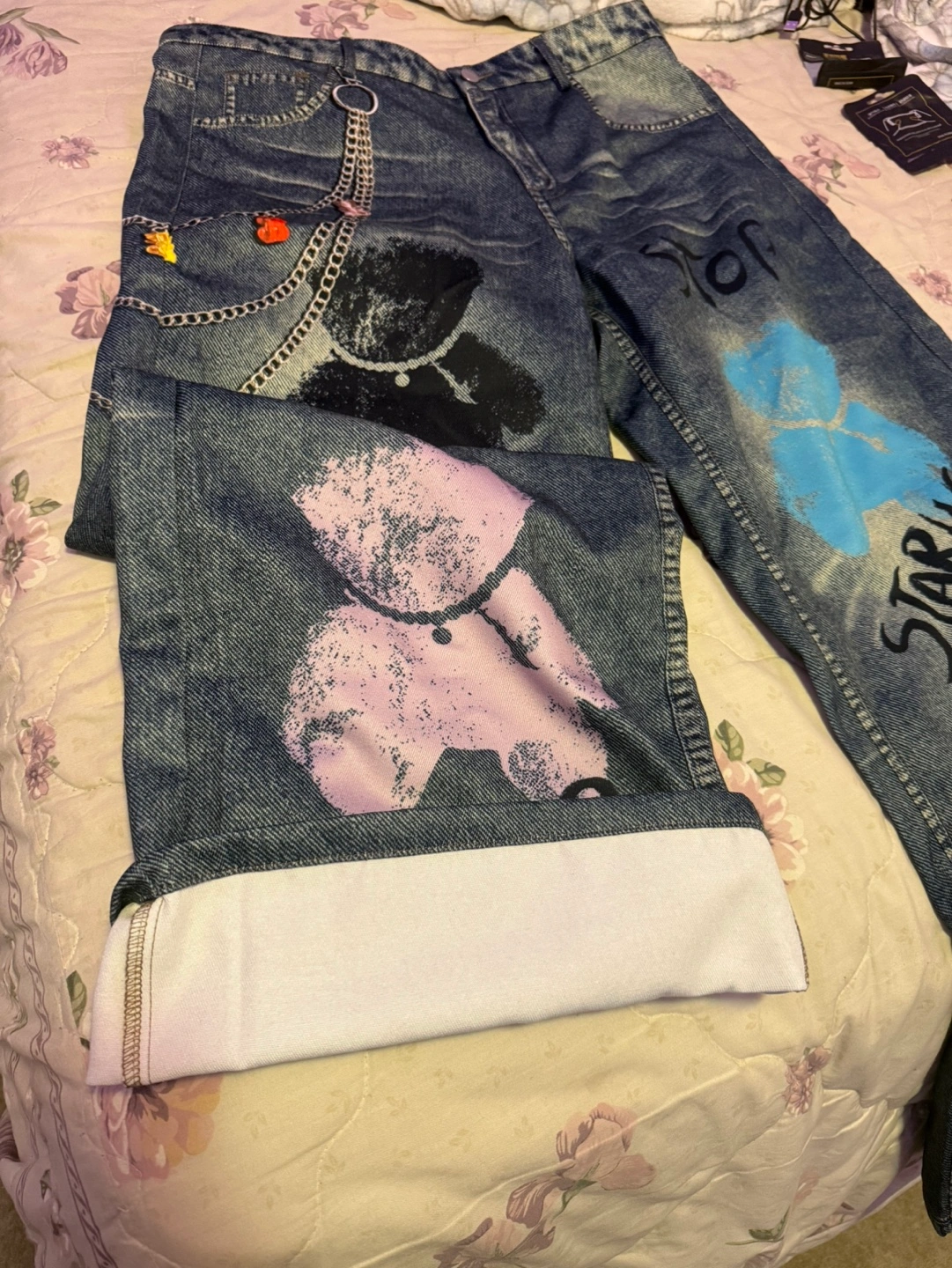 Blue denim baggy jeans with graphic designs and cold resistance.
