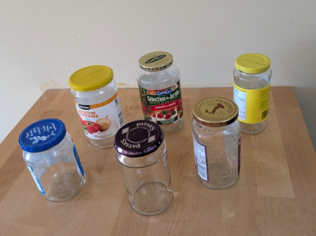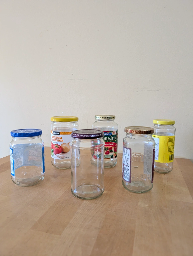 Set of 6 empty glass jars. Perfect for storing leftovers, crafts, or other projects. Clean and ready to use.