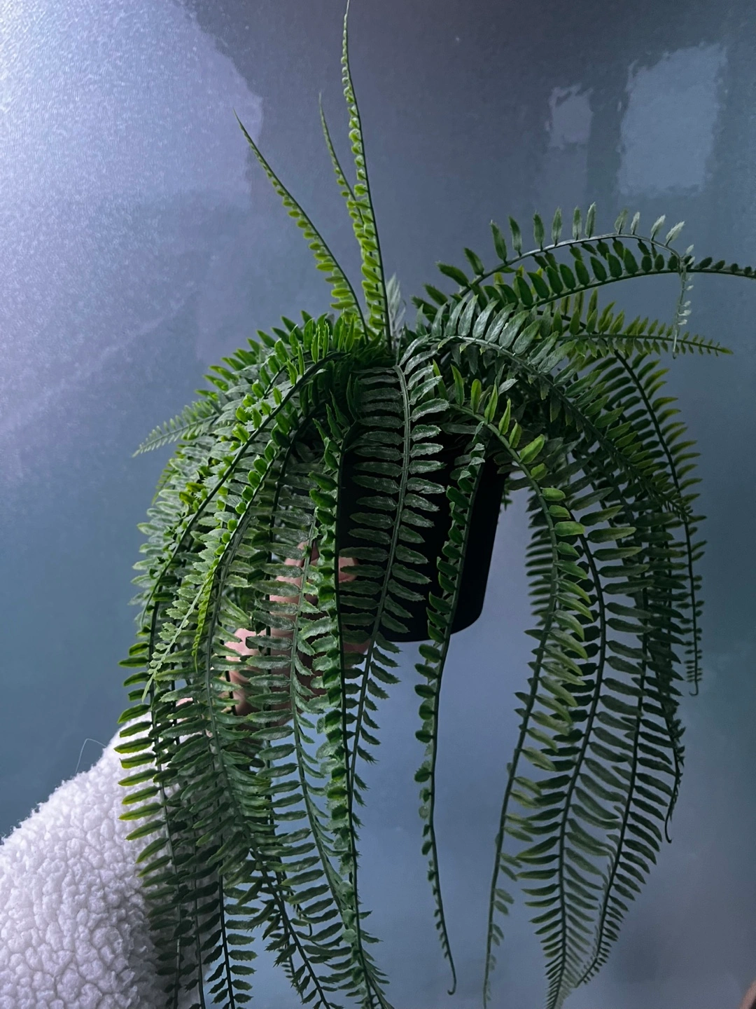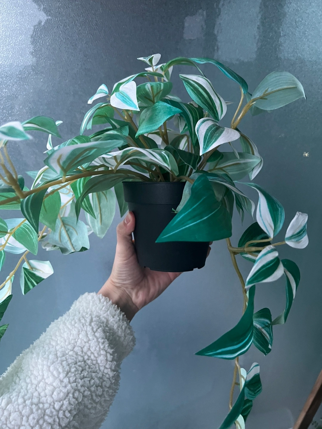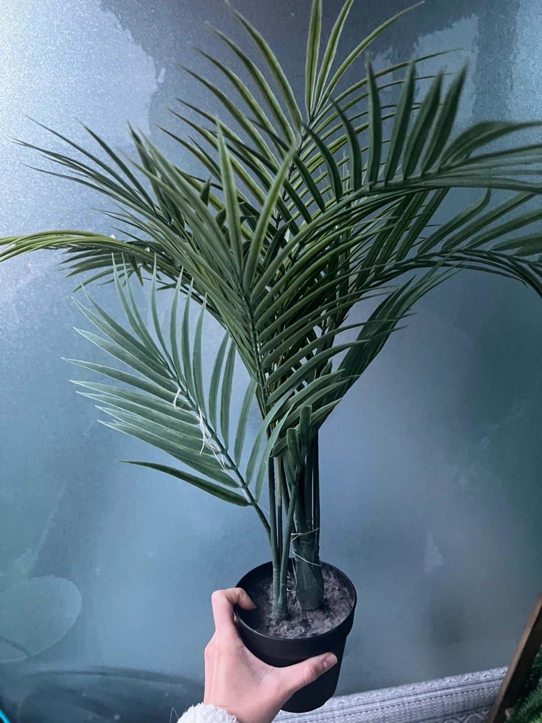 226Wooden plant stand from IKEA. Three fake plants, a fern, a leafy plant with white accents, and a palm tree. All in black pots. Perfect for indoor or outdoor use. Sold all together