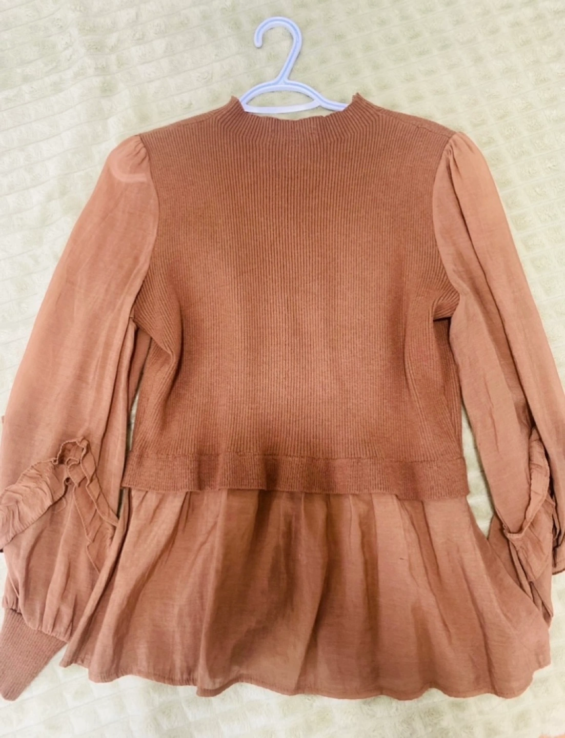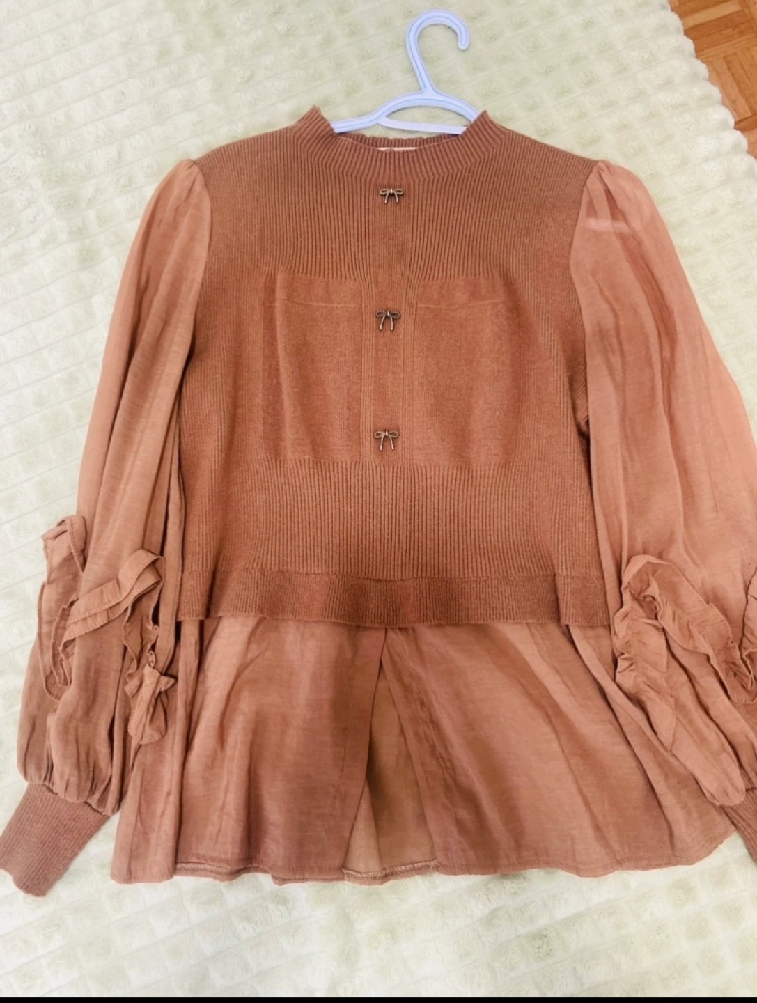 Long sleeve top with knit bodice and a sheer, ruffled overlay. Features decorative buttons on the front.