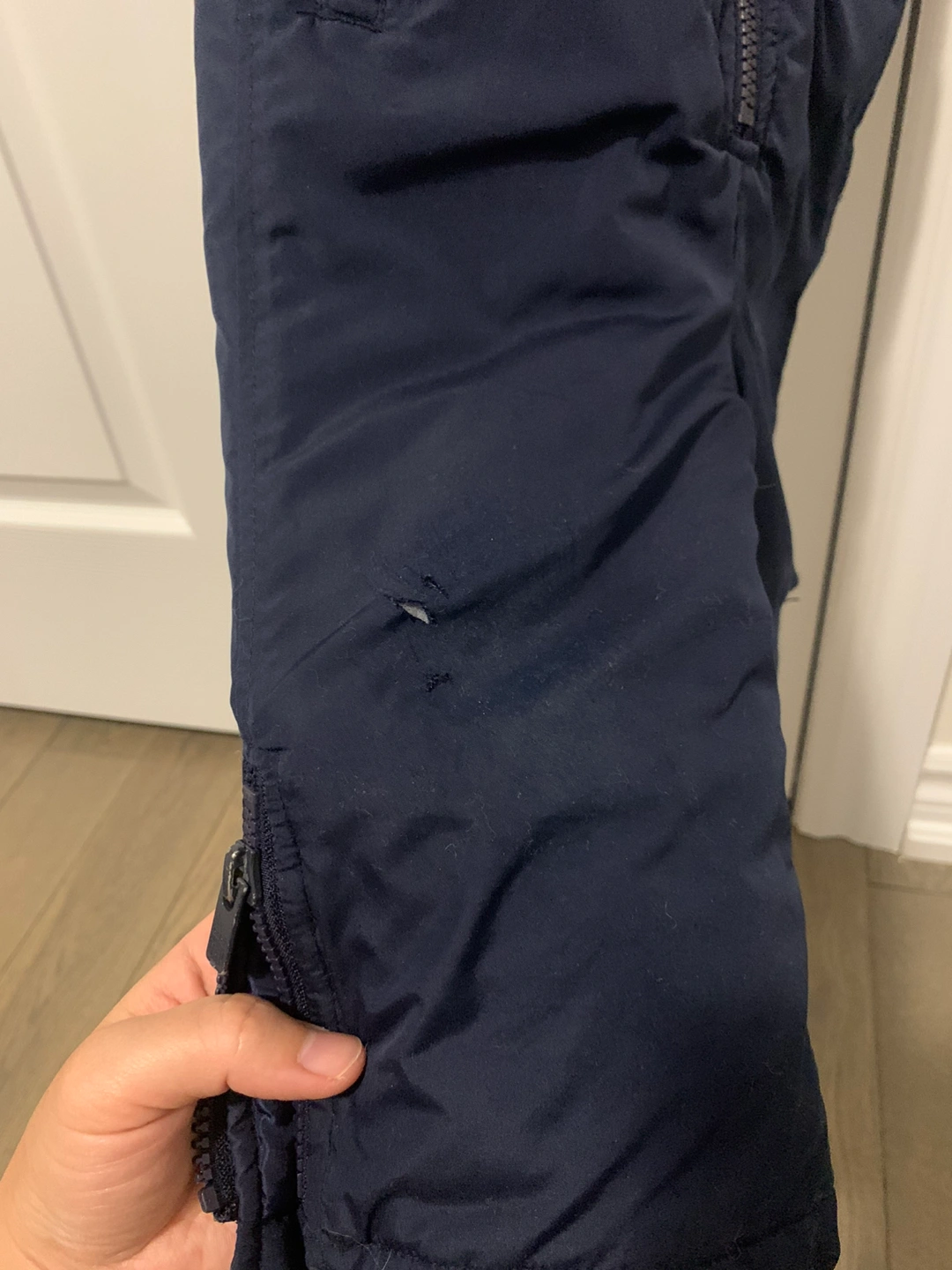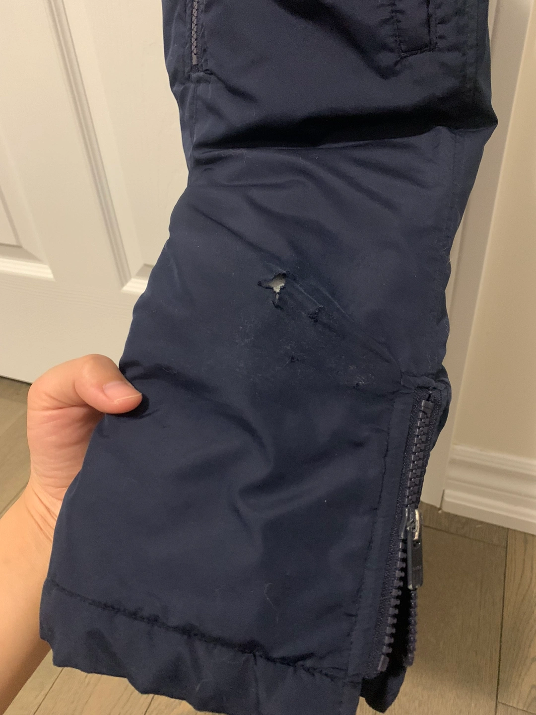 Small rip on front right knee area - see picture. Otherwise clean, well-loved condition.