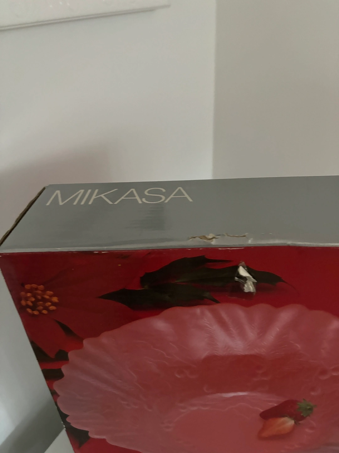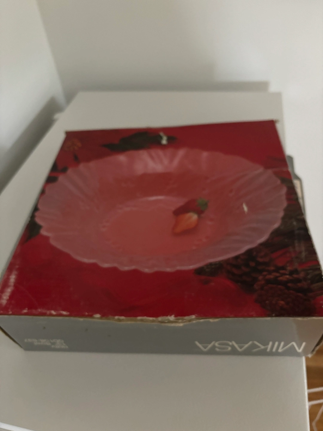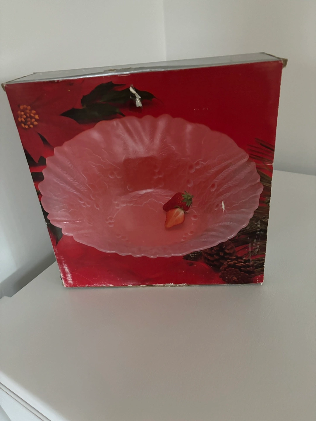 25Glass bowl in the Holly pattern. 13 inches in diameter. Made in Japan.