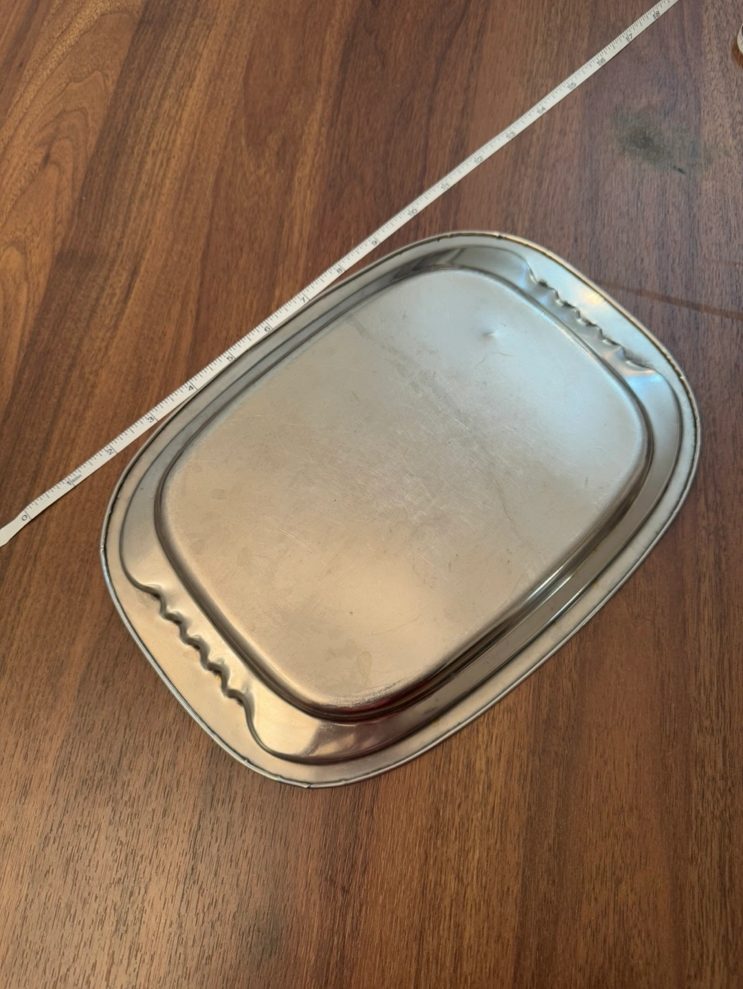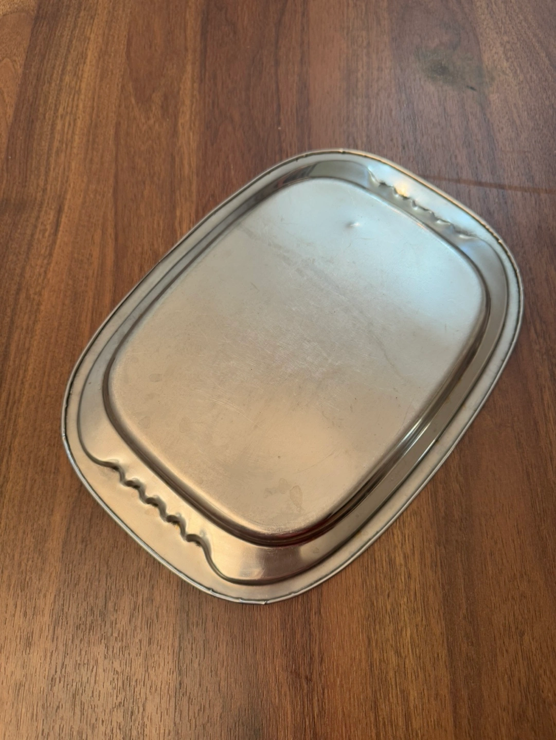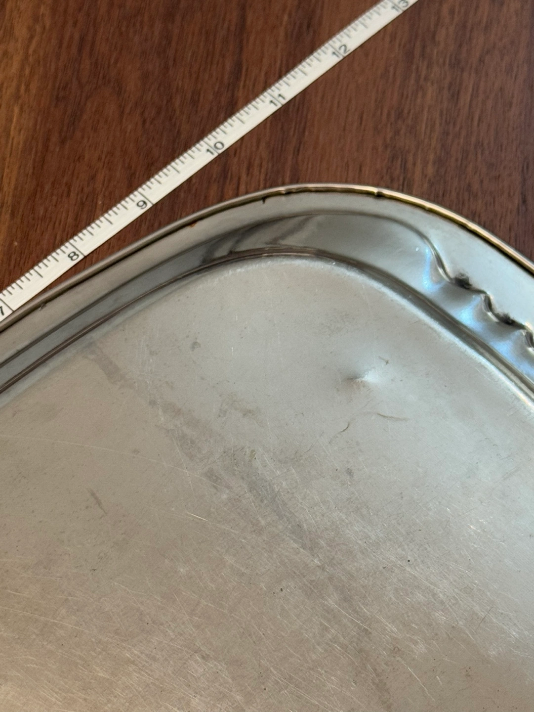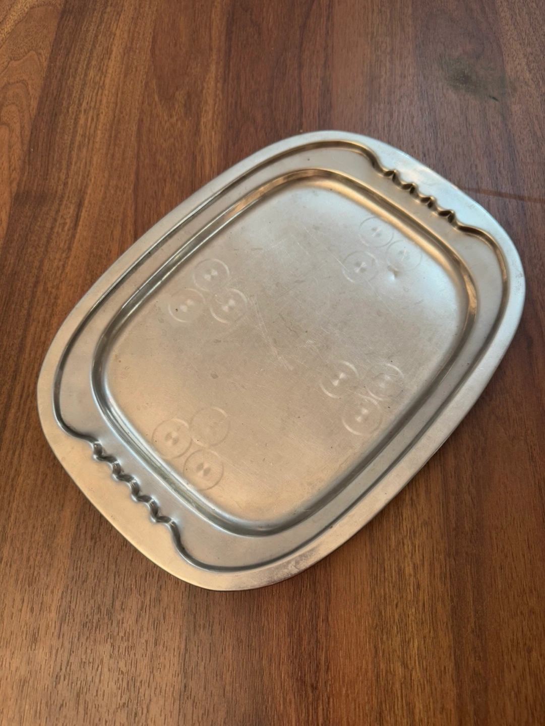 Small silver tray with a decorative design, perfect for serving snacks or small items. Has minor wear and tear.
