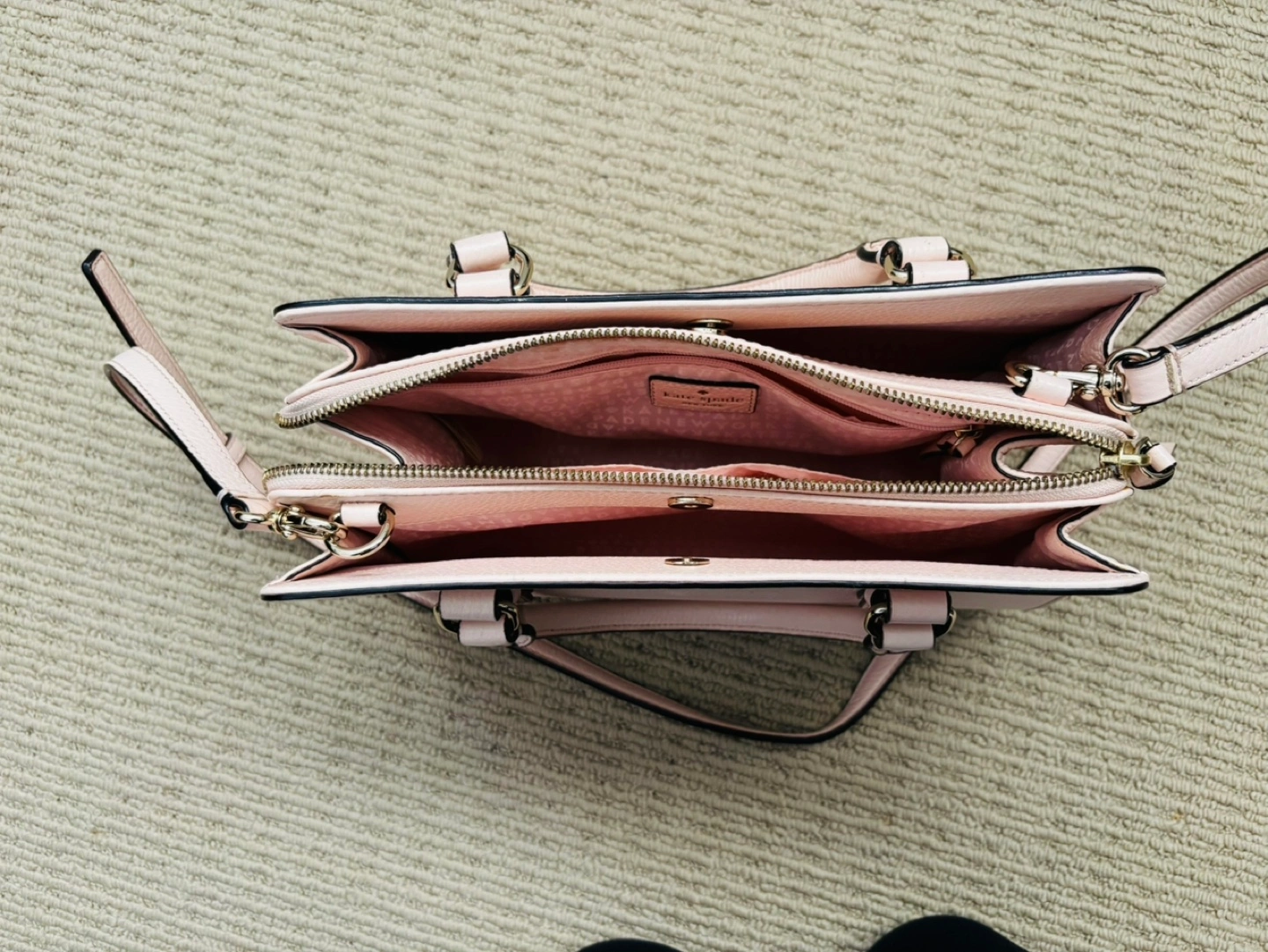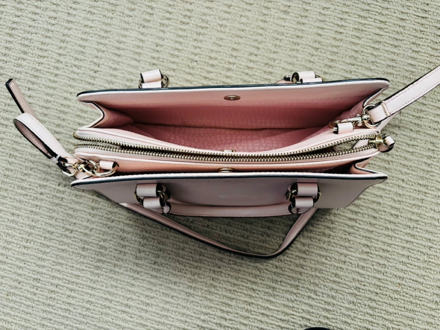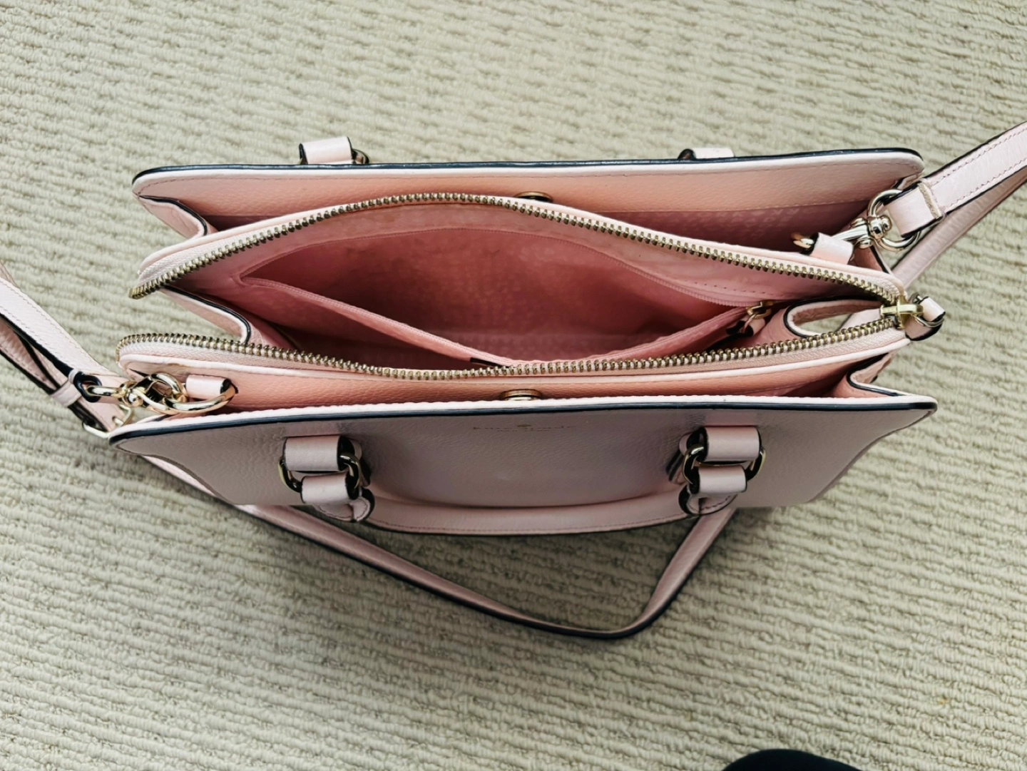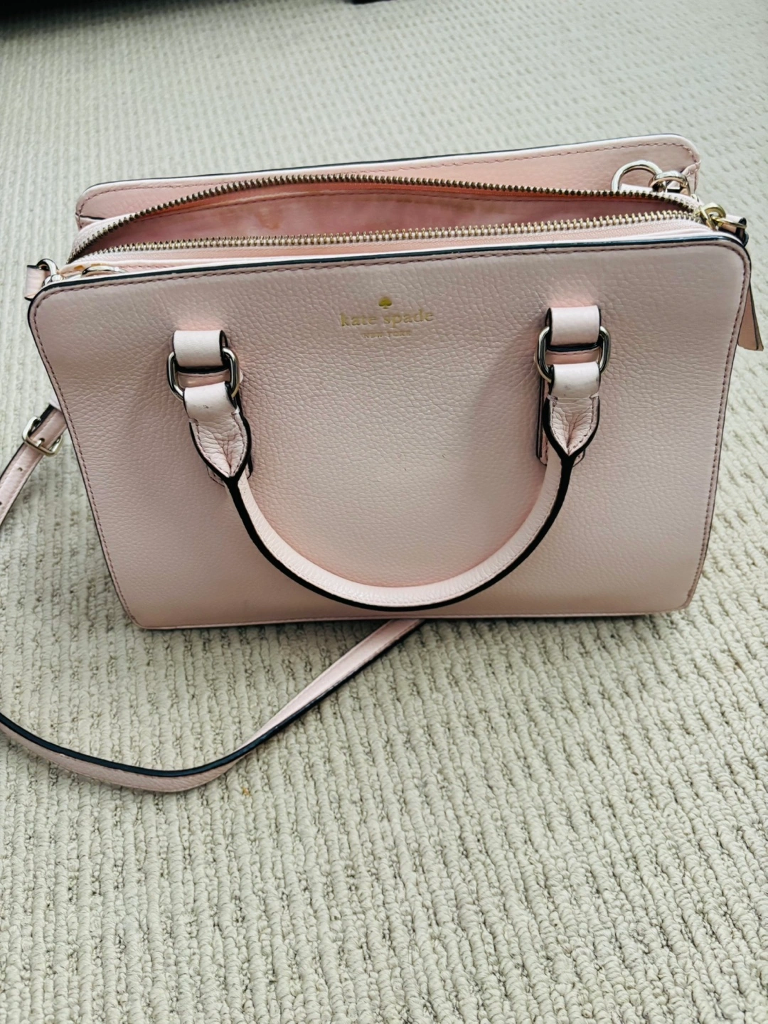 Large, light pink leather handbag with a long shoulder strap. Has two top handles and a gold zipper. Rarely used.