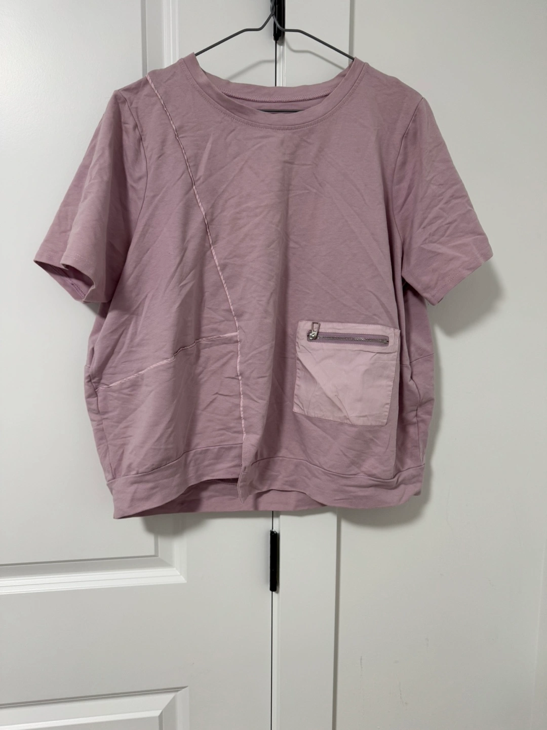 39Short-sleeved, pink T-shirt with a zippered pocket on the front. Cropped style.