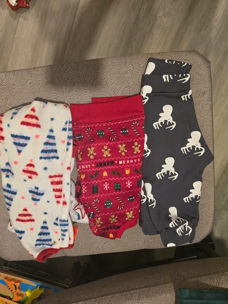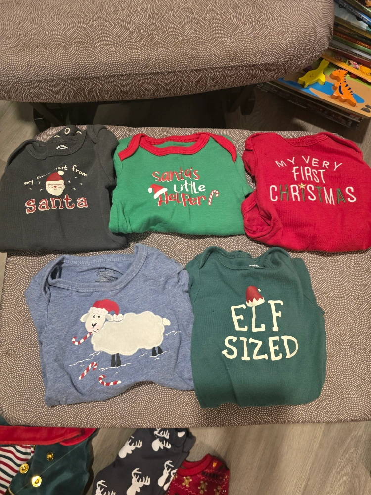 Bundle of baby Christmas clothes including onesies, pajamas, and a sweater all 3 -6 months $30 for all