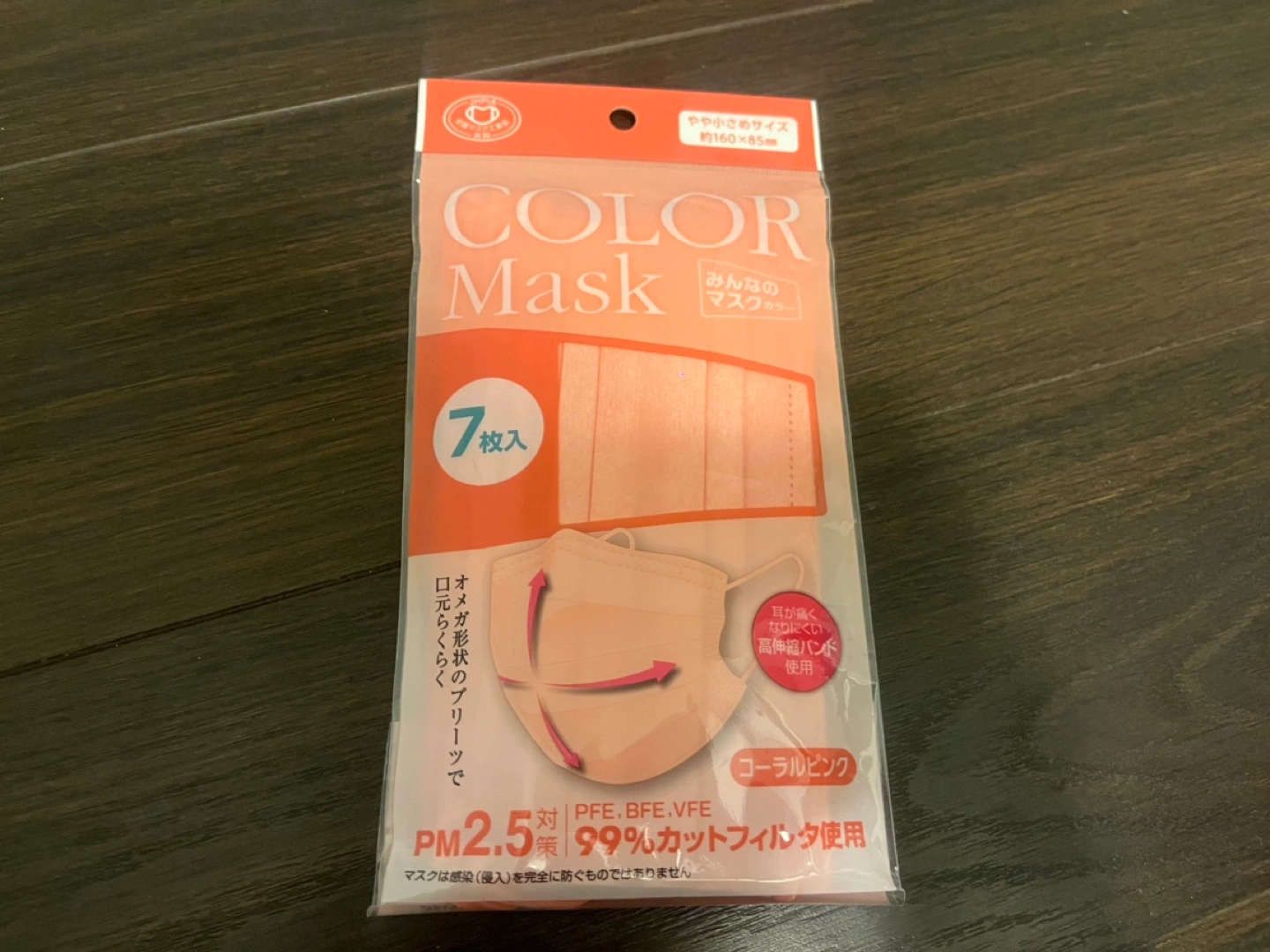 Colour masks. 7 masks in a package. Coral pink colour. Made with a 99% filter that is PM2.5 resistant. Omega shaped pleats provide a comfortable fit. Small size.