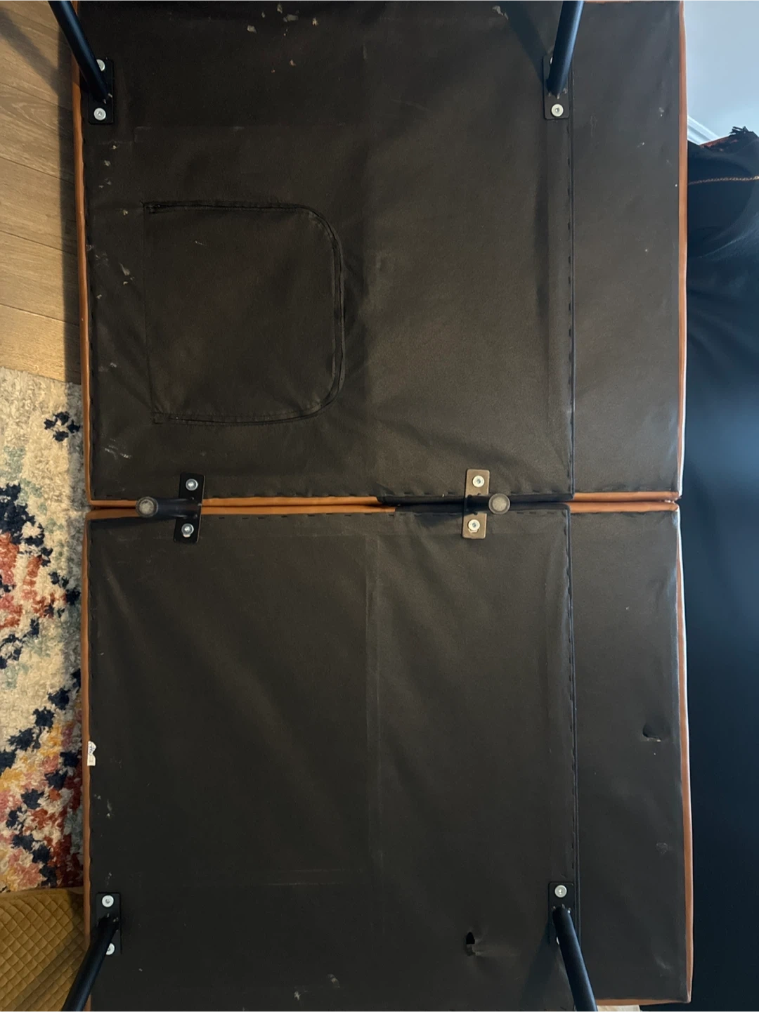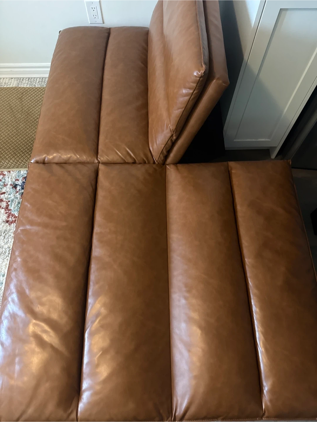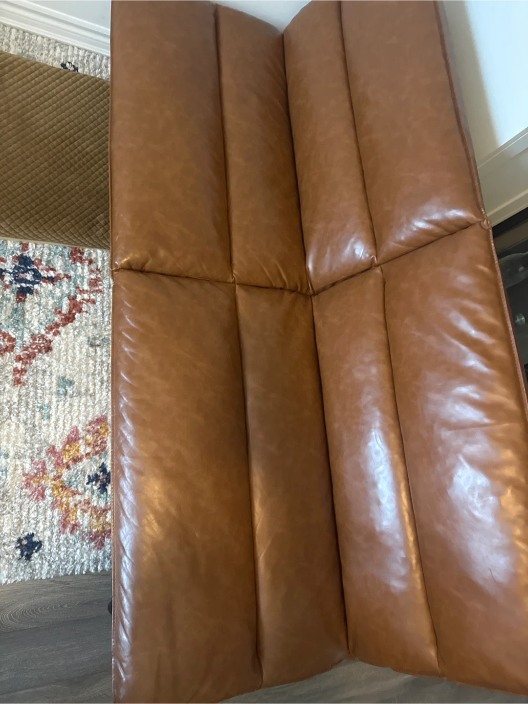 This bench ottoman is upholstered in brown faux leather. It's designed with a tufted top and has black metal legs. Perfect for adding extra seating or as a footrest. smoke free pet free. More information asked me