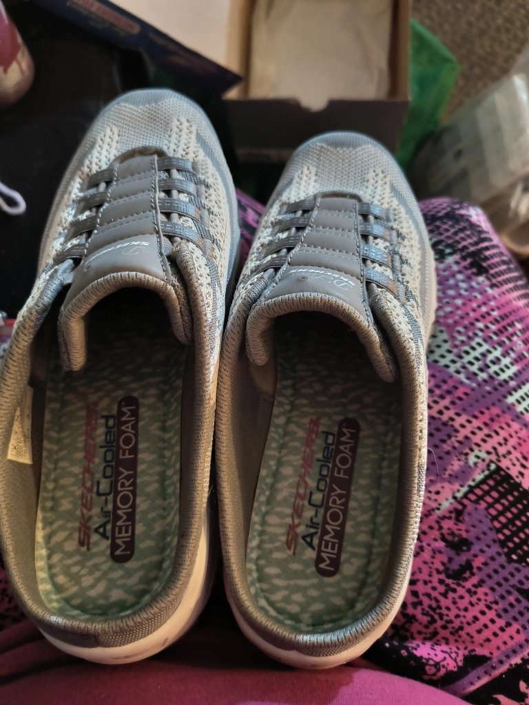 Grey and white Skechers clogs with Air-Cooled Memory Foam insoles. Size 8 US. D-Lites a new leaf.