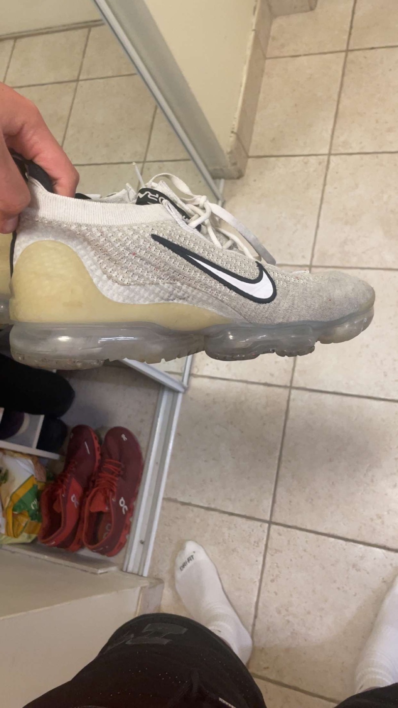 White and black running shoes with a clear sole. Worn but in good condition. Lemme know for more pics and vids