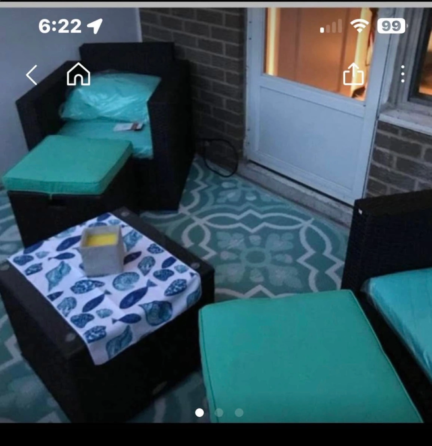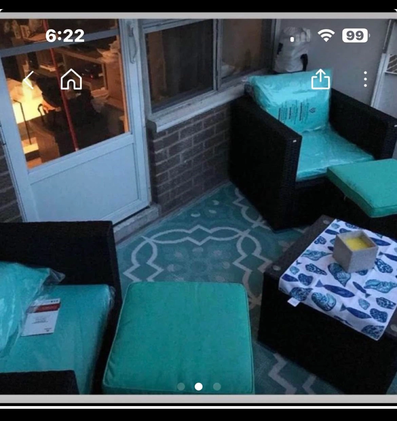 1355 piece patio furniture set. Two chairs with cushions, one coffee table, and two ottoman . Very sturdy set . Original price new was $1200 Purchased 2 chairs and table with cushions for $700 plus tax 2 ottomans with cushions over $400 plus tax ( 1 cushion has faded with exposure to sun) Just moved furniture in storage Eglinton and Bermondsey Pick up only at public storage unit Cash only