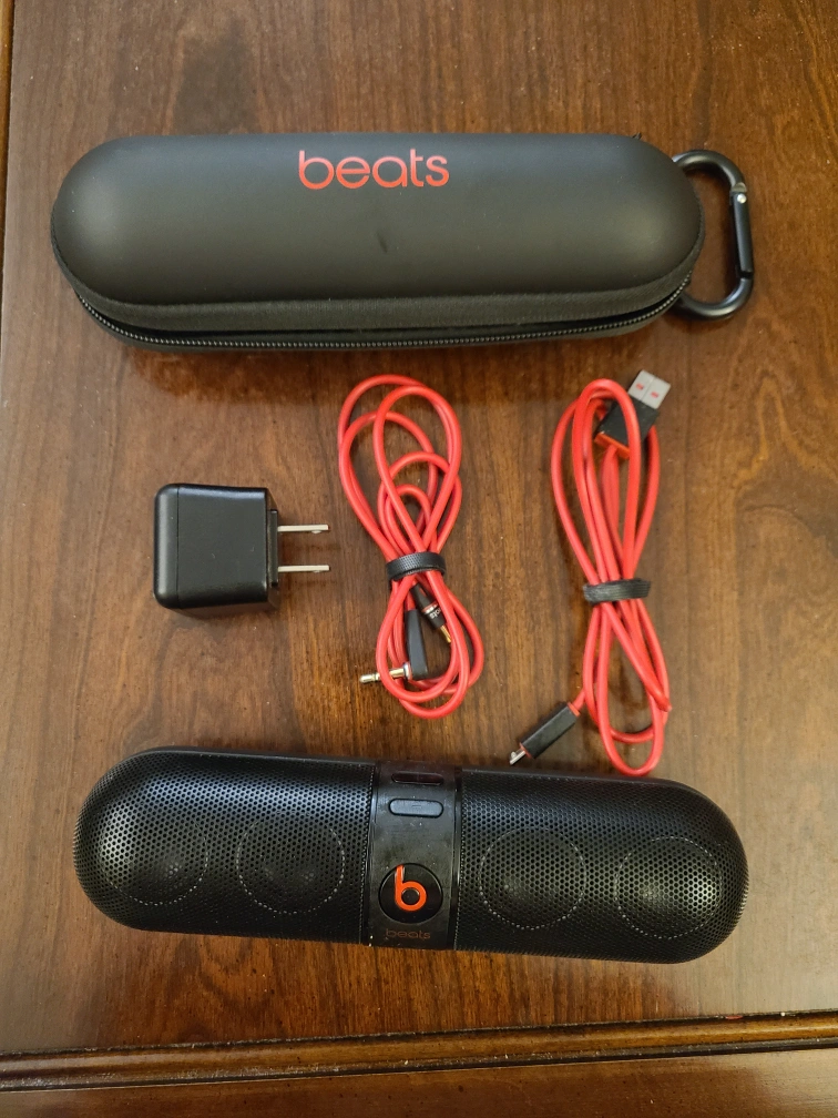 Portable Bluetooth speaker with charger, carrying case, and aux cable. Black & Red