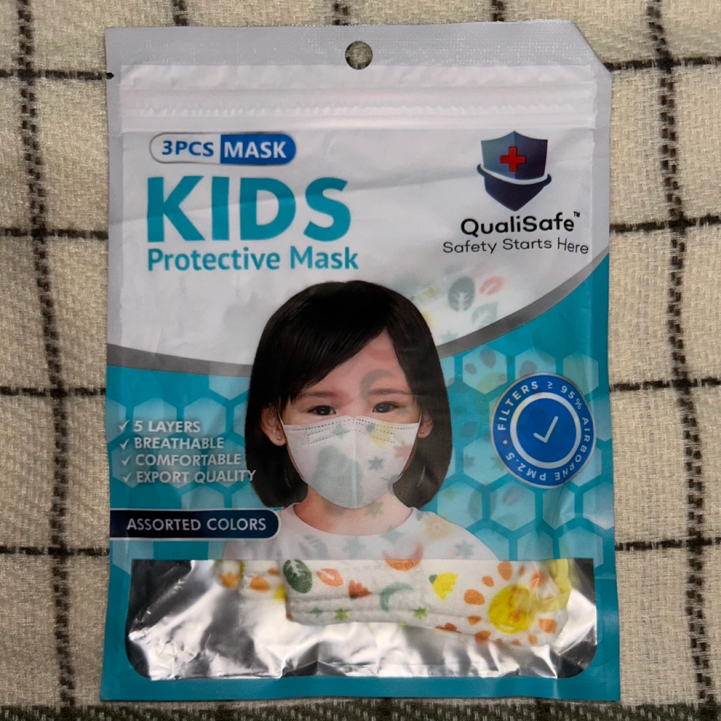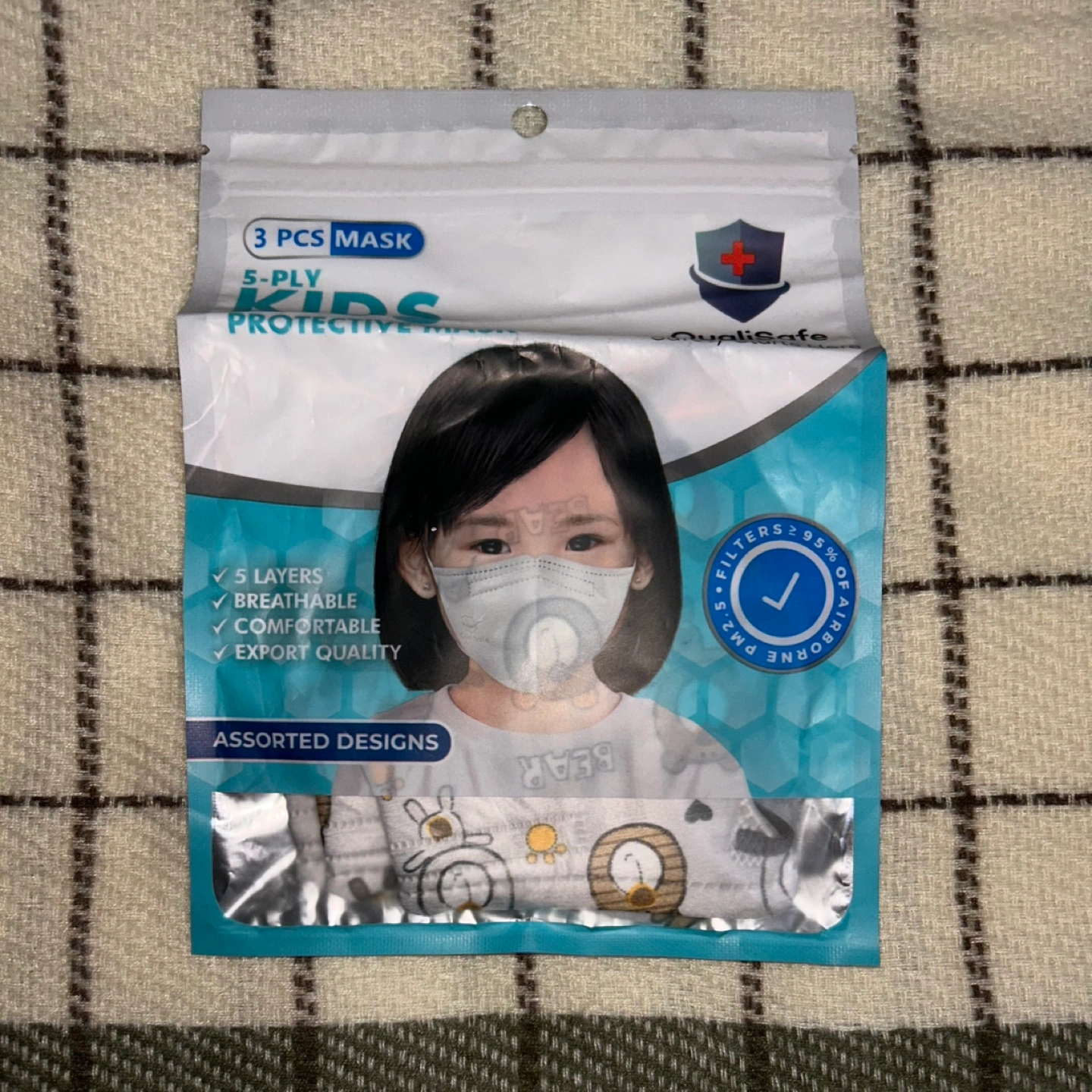 Package of three children's protective masks. Five layers of protection. Assorted colours and designs. Breathable and comfortable. Export quality.