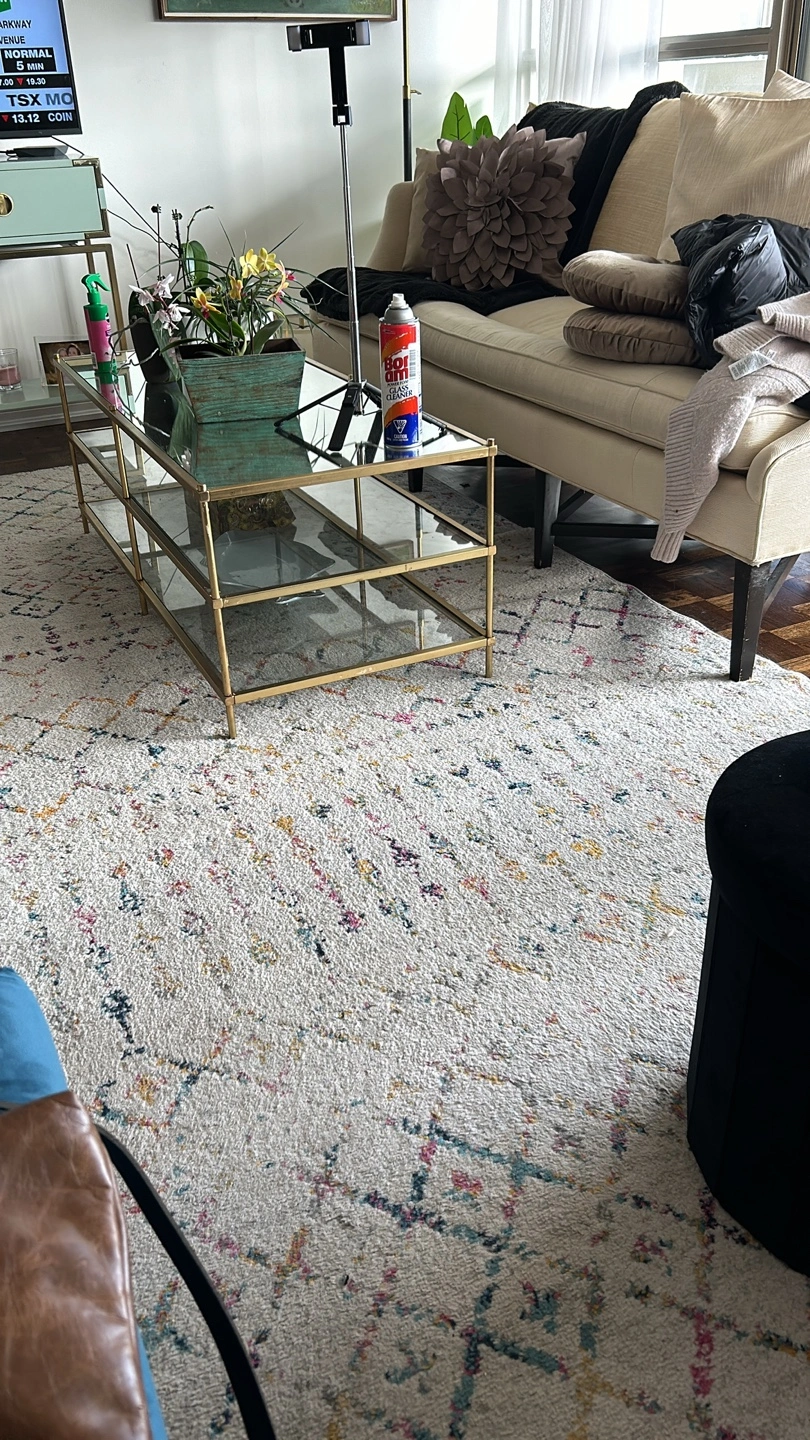 Video available.Large area rug, off-white base with multicolored geometric pattern. Features various shades of pink, blue, teal, and orange. Suitable for living room or bedroom. Good condition. Recently steam cleaned. Stain just don't stick to this. Wayfair. Comes with under grip. Pet free smoke free home